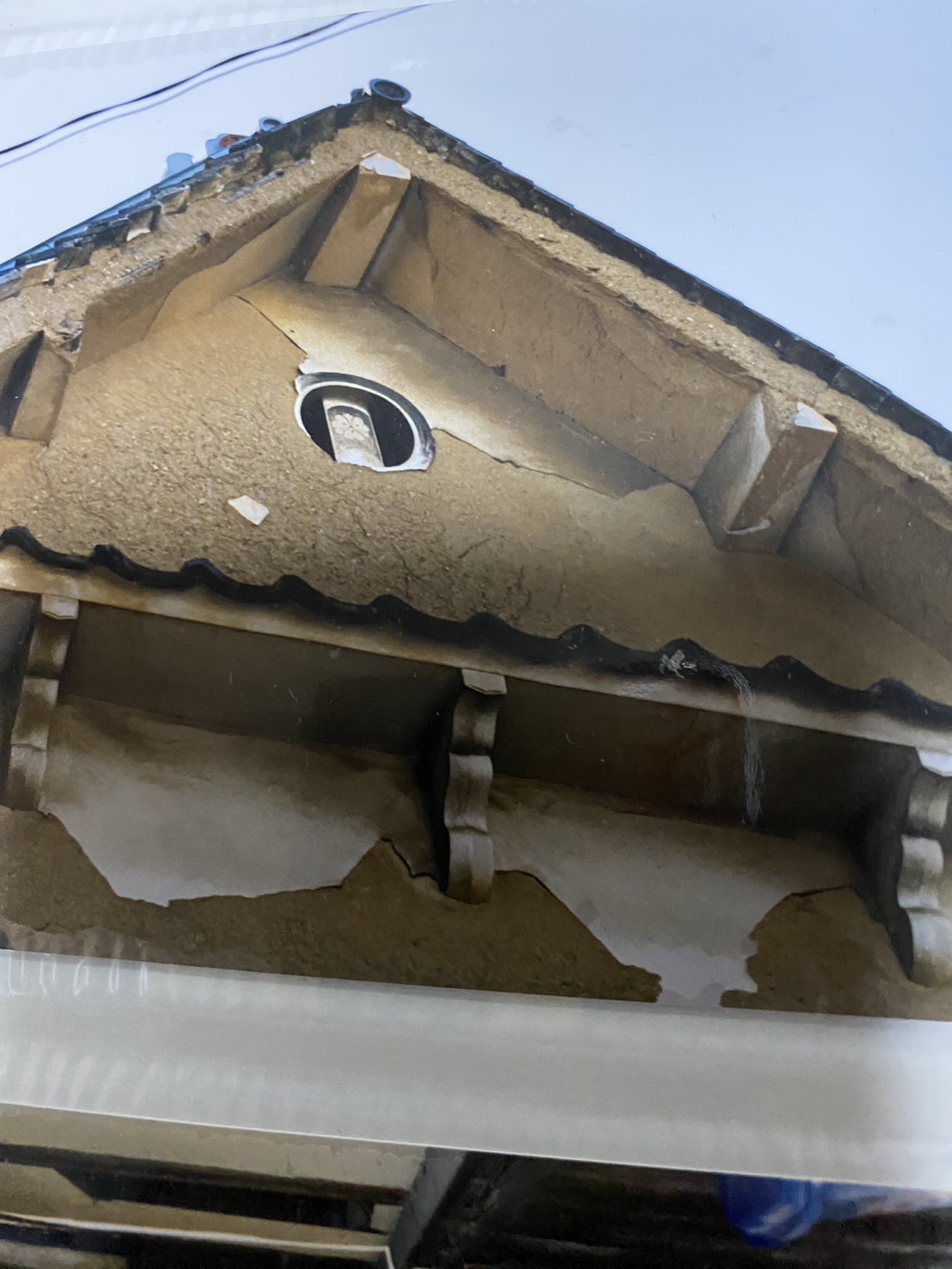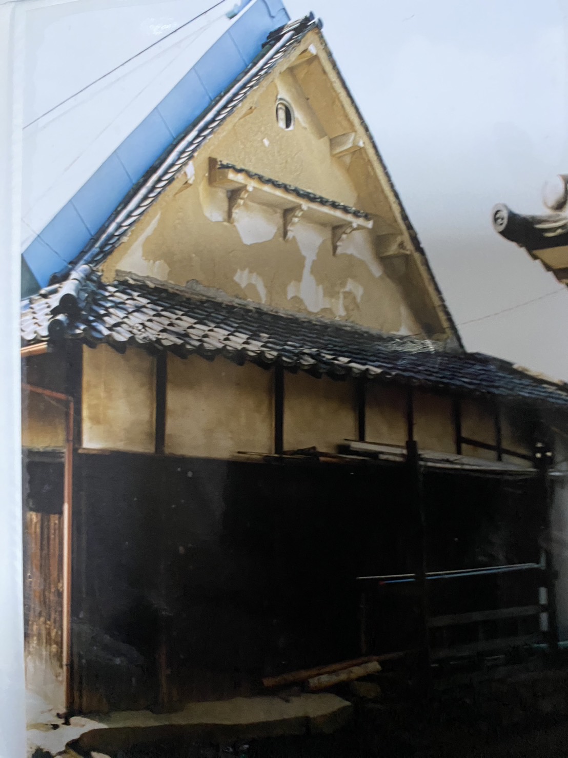台風のあと、落屋根にあった煙出しが壊滅的な打撃をうけ、同時に屋根が一部破損。