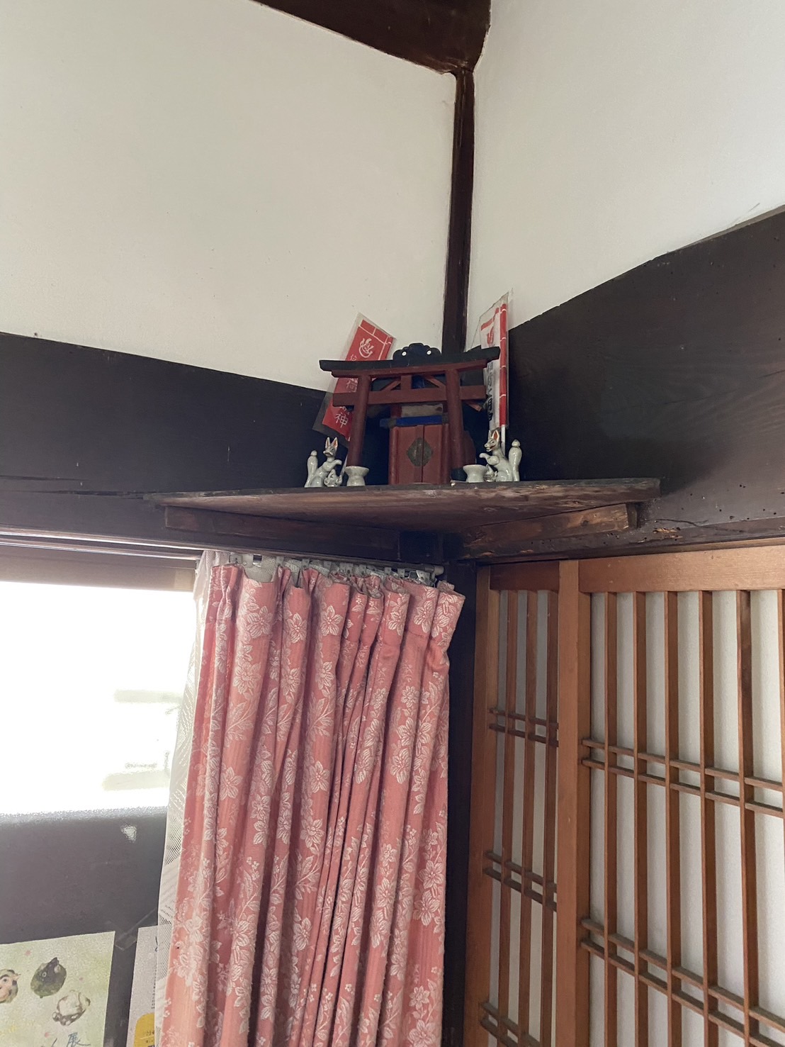 下の座敷にある、お稲荷さんと、居間にある神棚と供え棚です。台所は荒神さんが祀られていました。