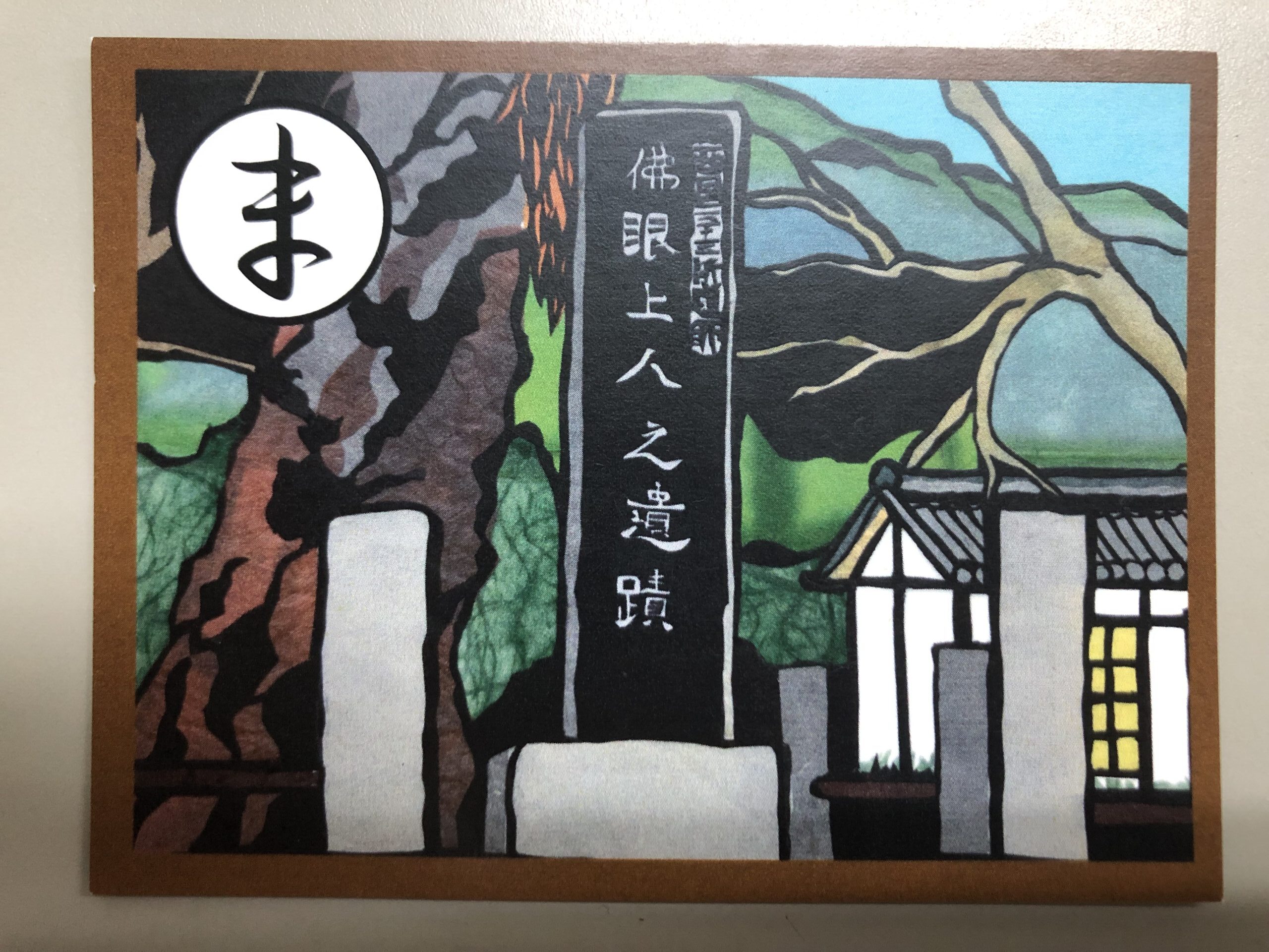絵札には、葉室小宮(はむろこみや)と呼ばれる小さな社の横にある「佛眼上人之遺蹟」の碑が描かれています。