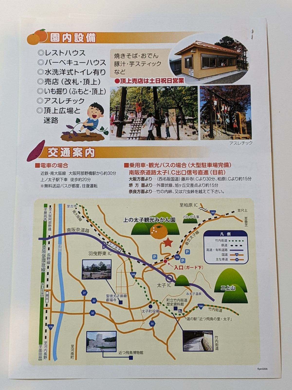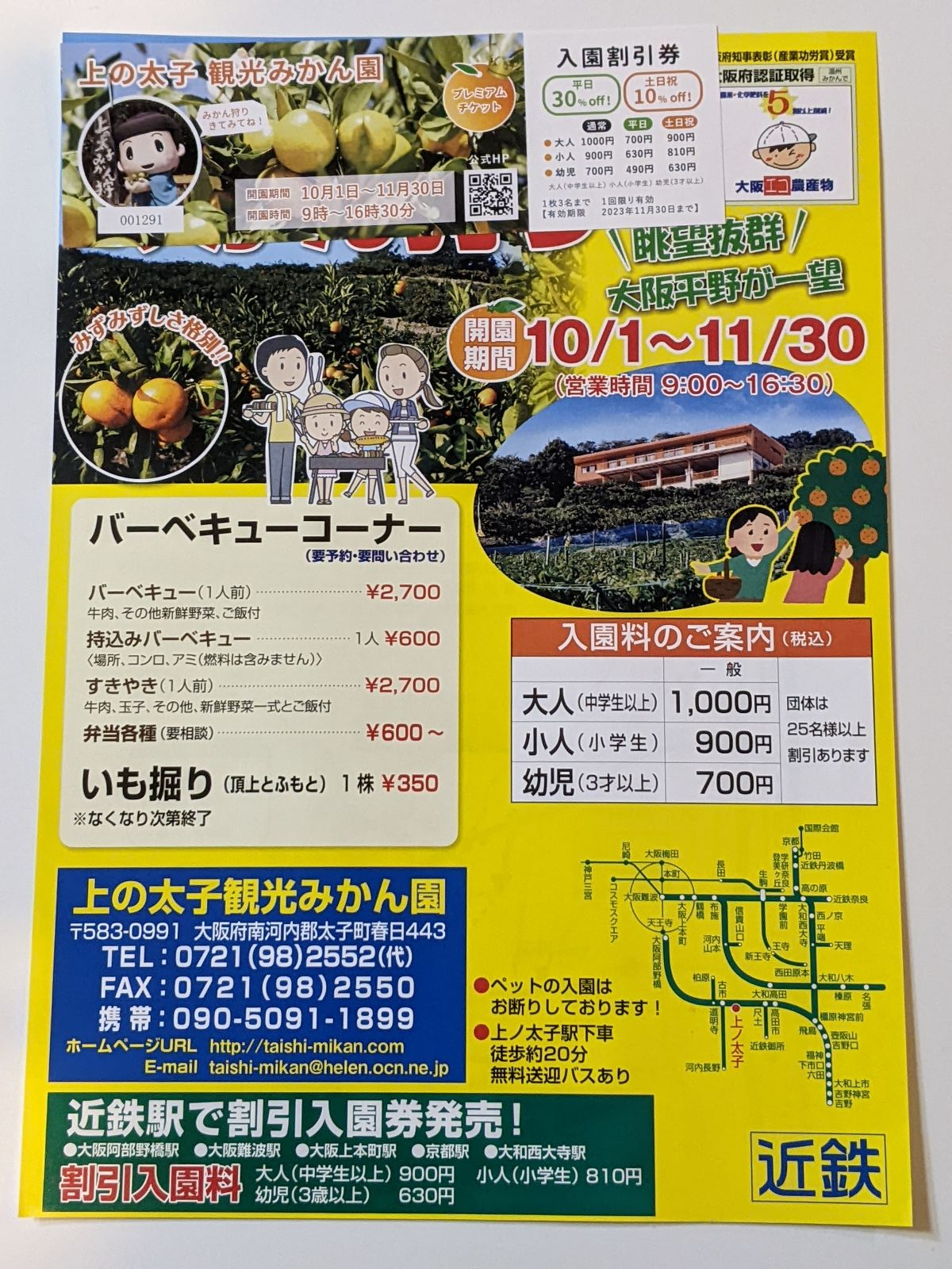 | アクセス | 【電車】は近鉄南大阪線「上ノ太子駅」で下車 【駅から】徒歩20分もしくは予約不要の無料送迎バス(駅始発9:10からみかん園最終16:30発) 【車】南阪奈道路太子I.Cより出口信号を直進(目前)。 車は近鉄電車のガードを目印にふもとの駐車場に停めてください。 カーナビ等の案内で直接山頂についた場合、駐車場はありません。 |