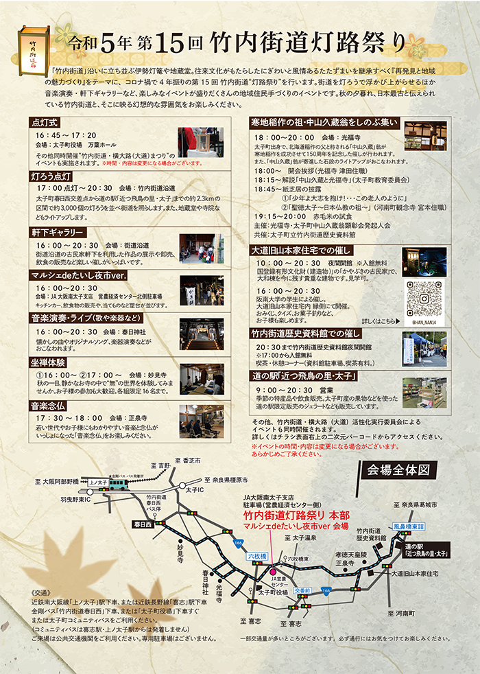 令和5年10月21日(土)、4年ぶりに太子町の秋を代表する「竹内街道灯路祭り」が開催されます。