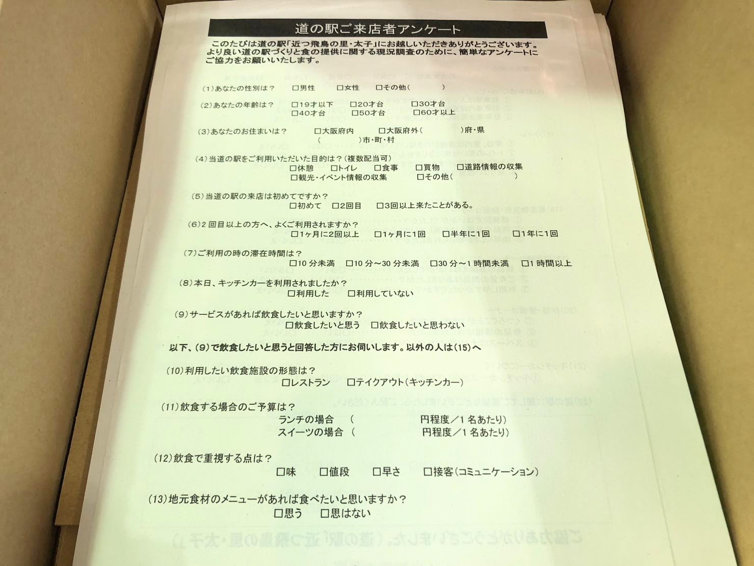 アンケートはの具体的な内容は、年齢・性別・道の駅の利用回数や今後展開してほしいサービスに関する質問でした。