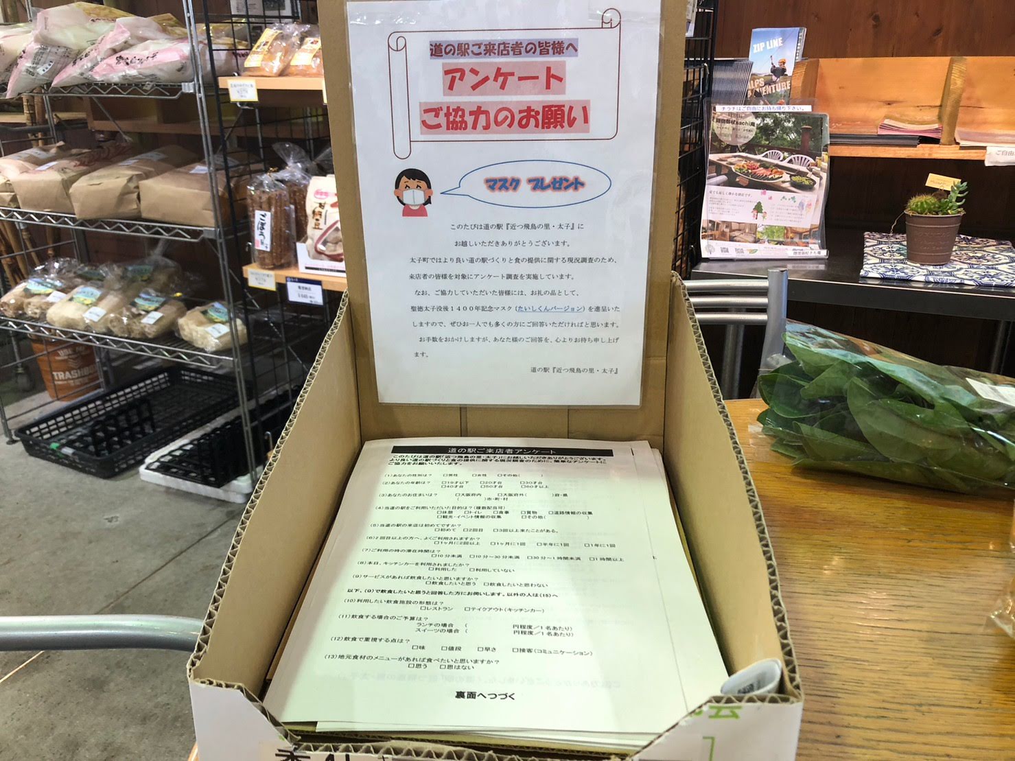 道の駅 近つ飛鳥の里・太子にてアンケートに答えるとなんと今だけ!「たいしくんマスク」がゲットできます。