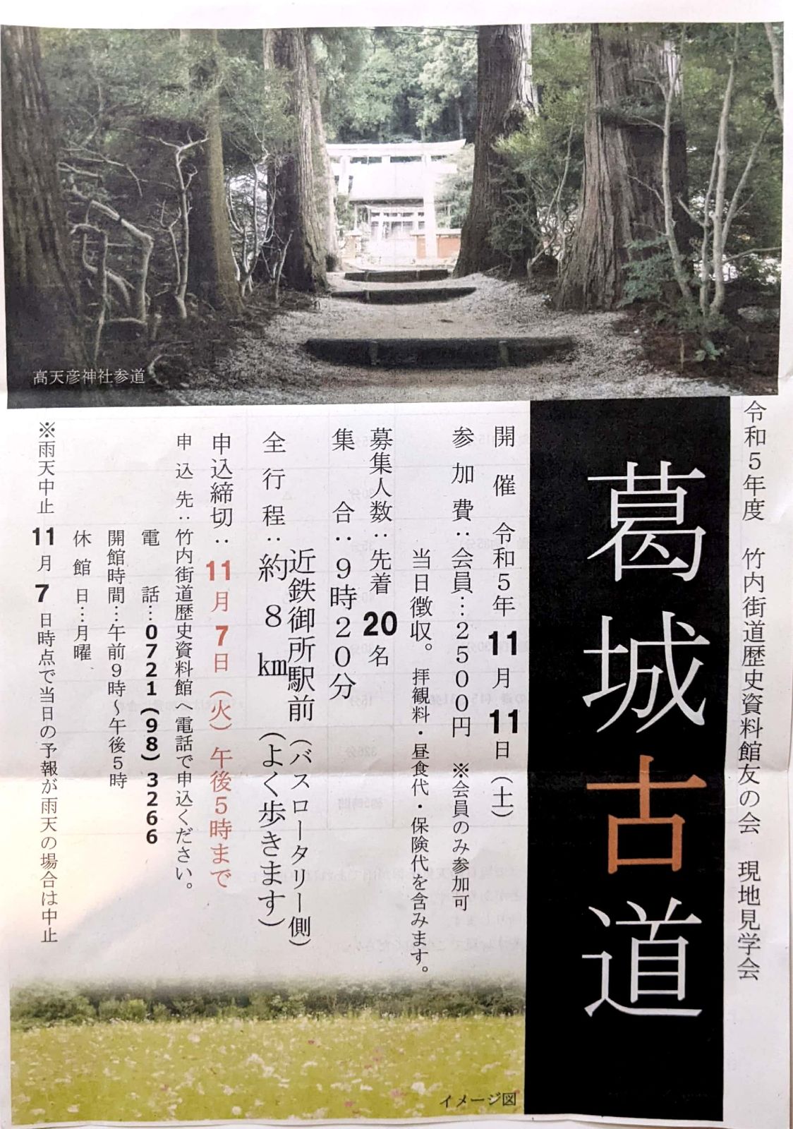竹内街道歴史資料館友の会の現地見学会として「葛城古道のツアー」が開催されます。