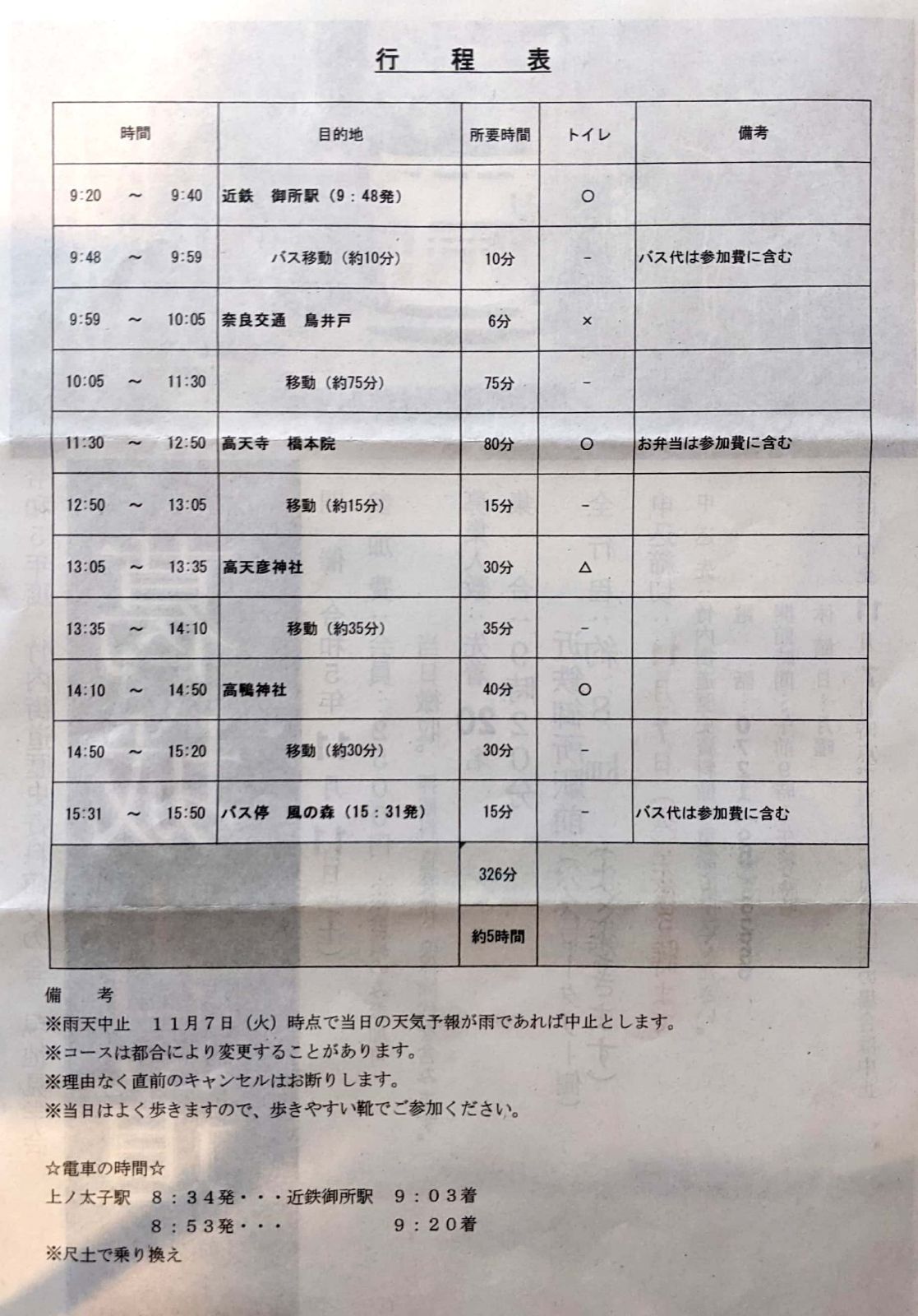 11月11日に開催される「葛城古道のツアー」は、9時20分に近鉄御所駅前から約8キロほど歩いて観光を楽しむ予定だということです。