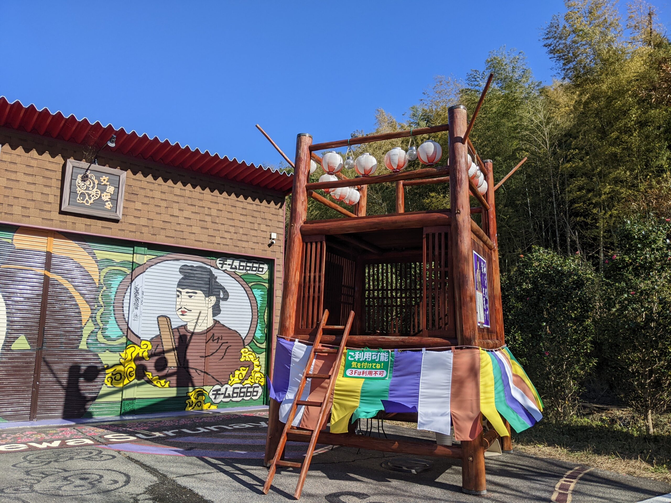 バイク神社の敷地内にはゆっくりと話すことができる机や椅子、自動販売機、そしてなんと櫓(やぐら)までありましたよ。