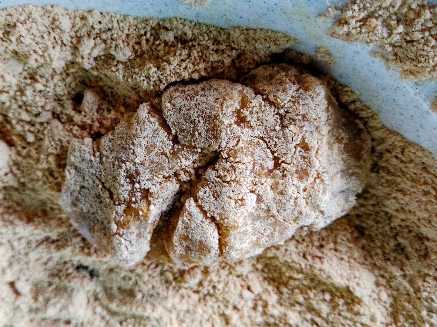 きな粉をまぶす前の熱々のあかねこ餅は、小麦の香ばしいさともち米の甘い香りがなんとも食欲をそそる香りでした。