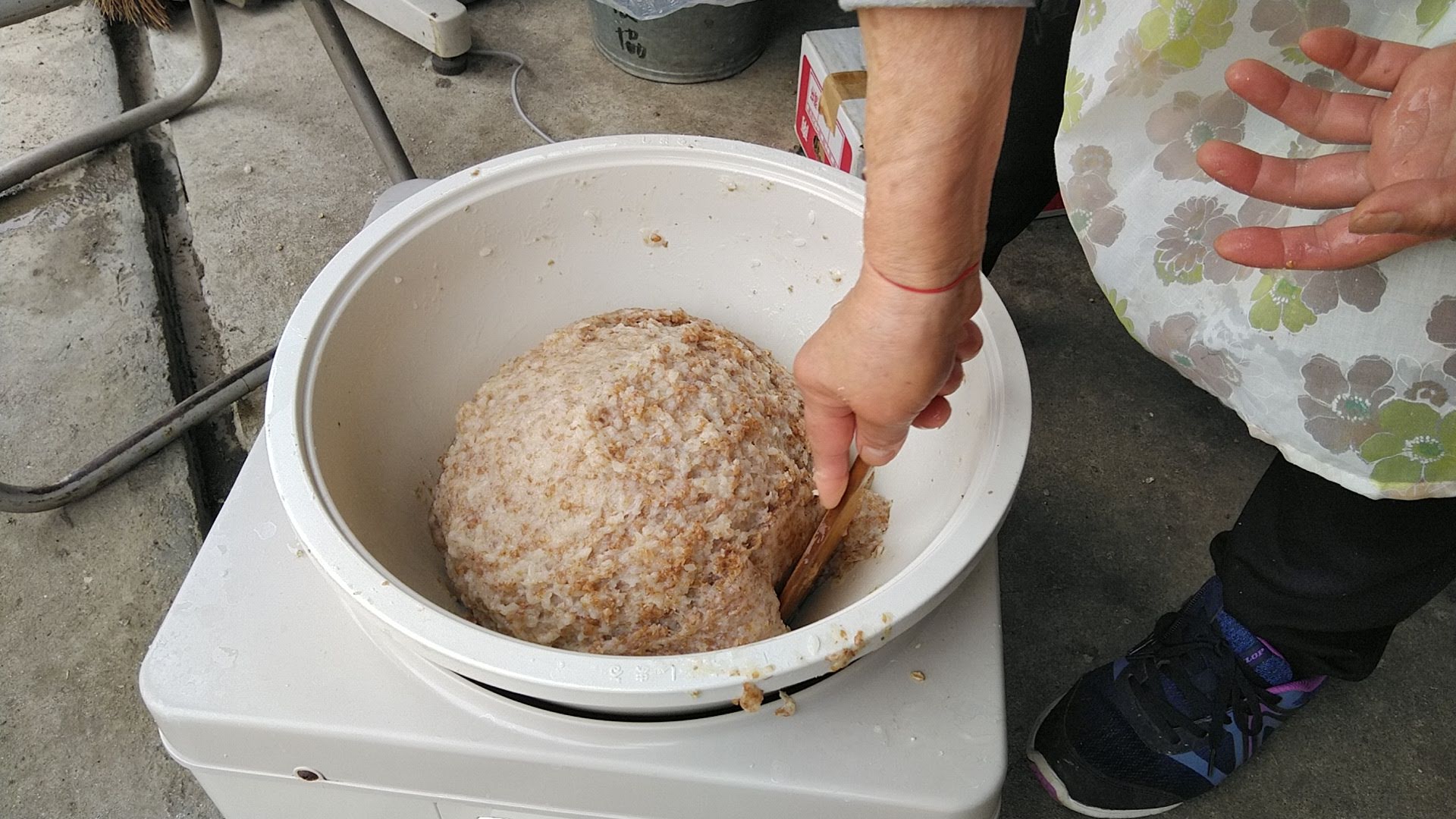 もち米と麦だけでは固くなってしまうので、1回の餅つきにつき炊いたごはんをお茶碗1杯分ほど混ぜるのがコツなんだとか。