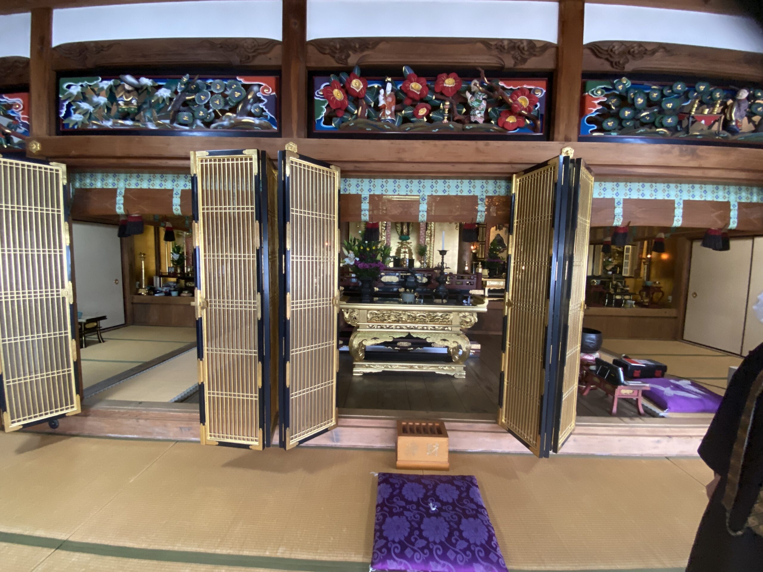 御本尊の前の欄間には、一般的に極楽浄土を表した彫刻が施されていることが多いのですが、仏陀寺の欄間は「二十四孝(にじゅうしこう)」を題材とした非常に珍しい彫刻です。