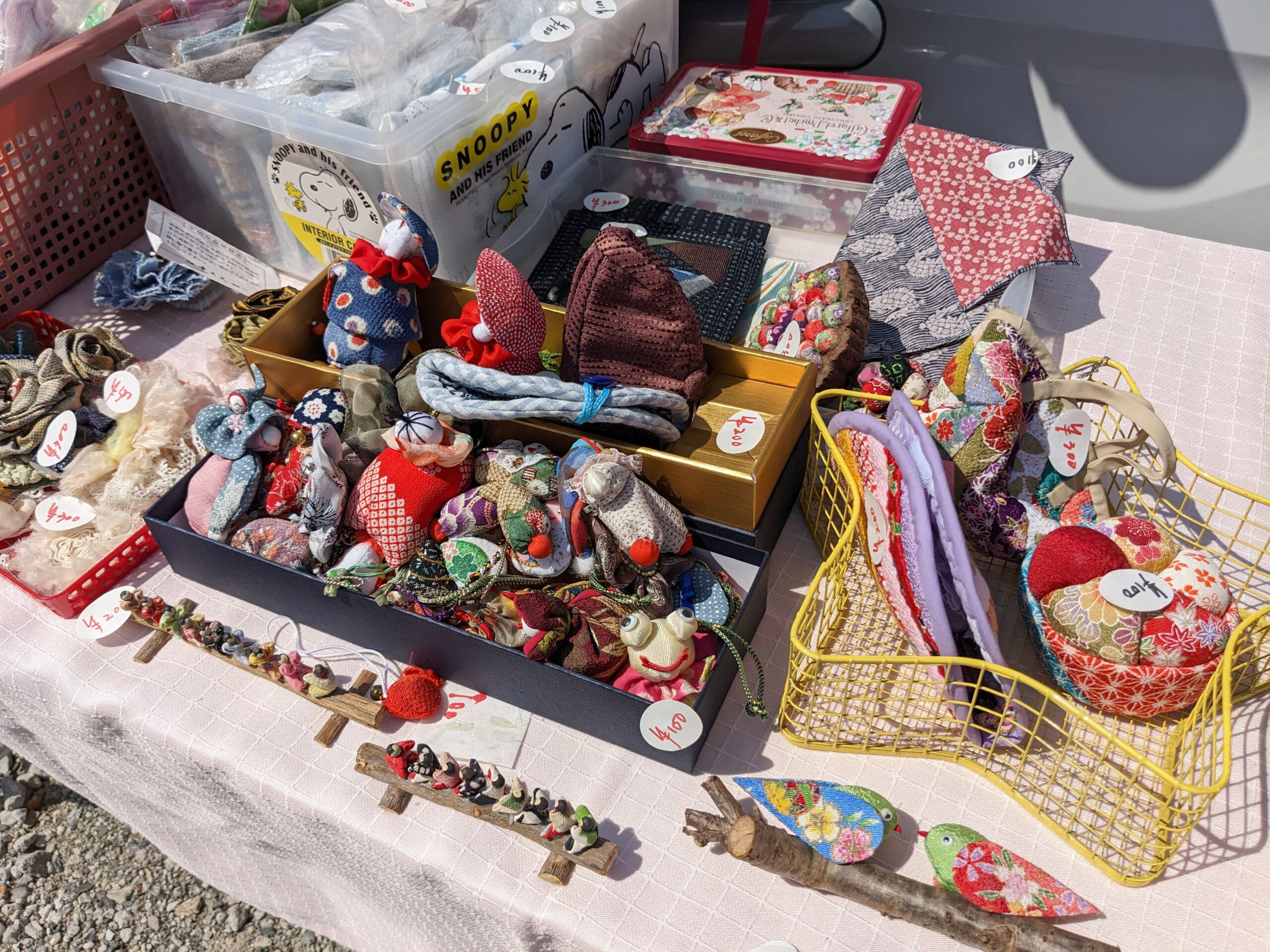 特に取り扱いが多かったのは手作りの小物です。ご高齢のお母さんが作られたという着物の端切れの髪飾りやブローチ、手編みのコースターなど色とりどりの商品が並べられていました。