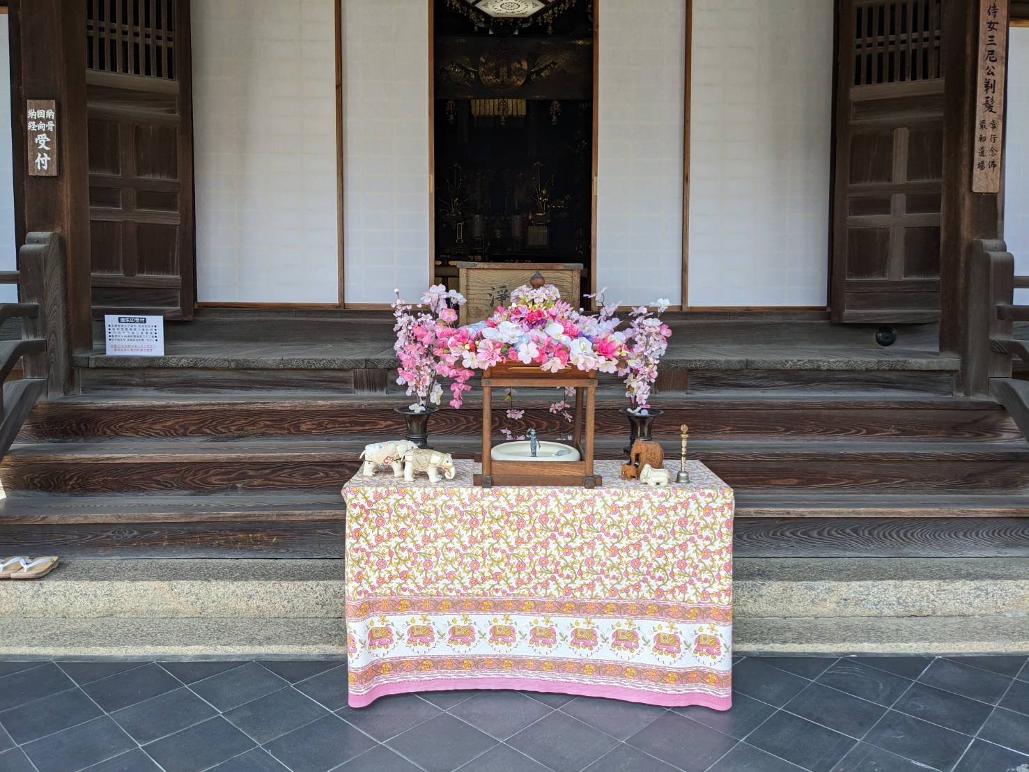 お伺いした日は花祭り当日より少し前でしたが、お堂の前に色鮮やかな花御堂が飾られていました。