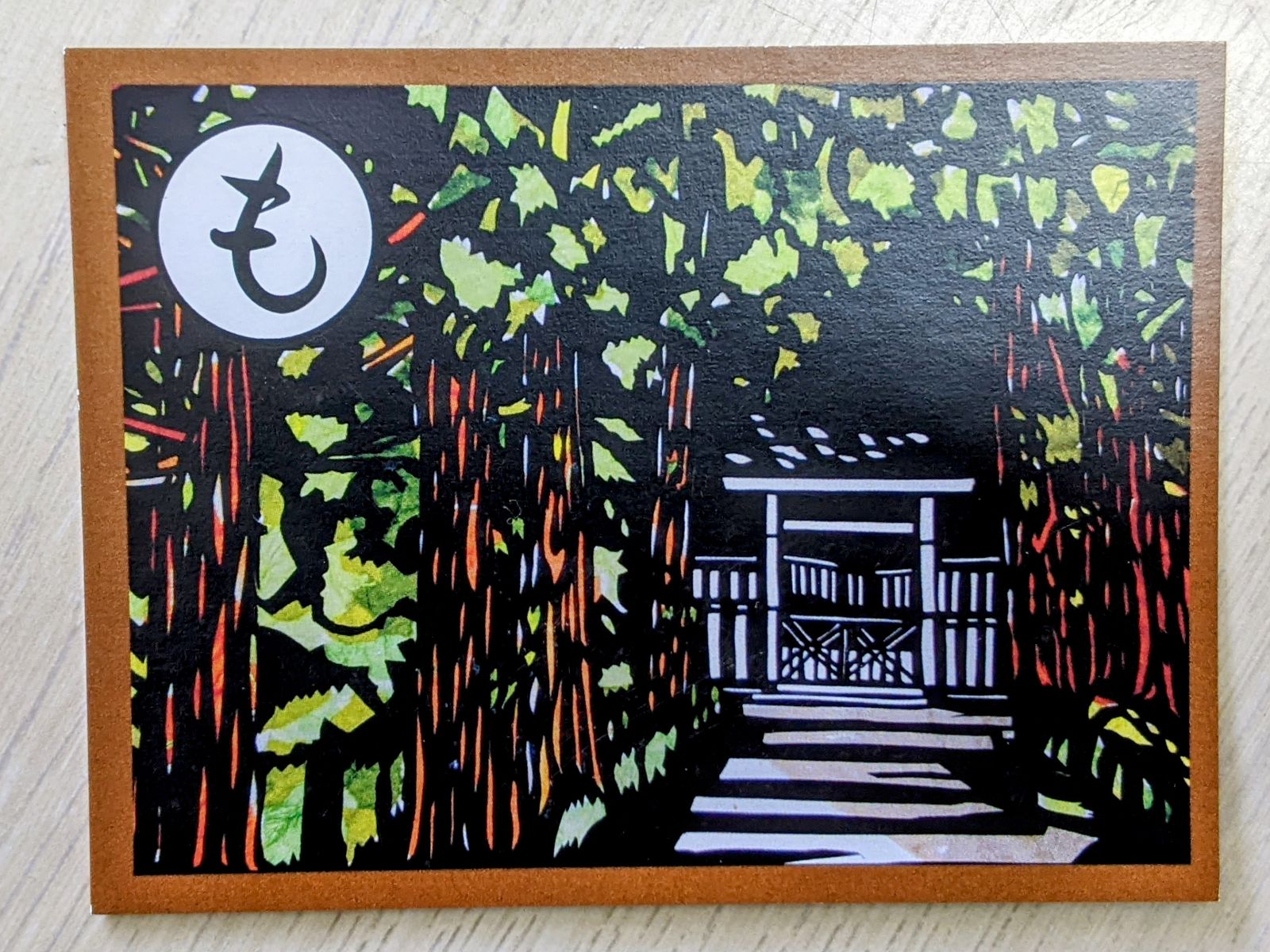絵札には、木のトンネルをくぐった先に見える鳥居が描かれています。