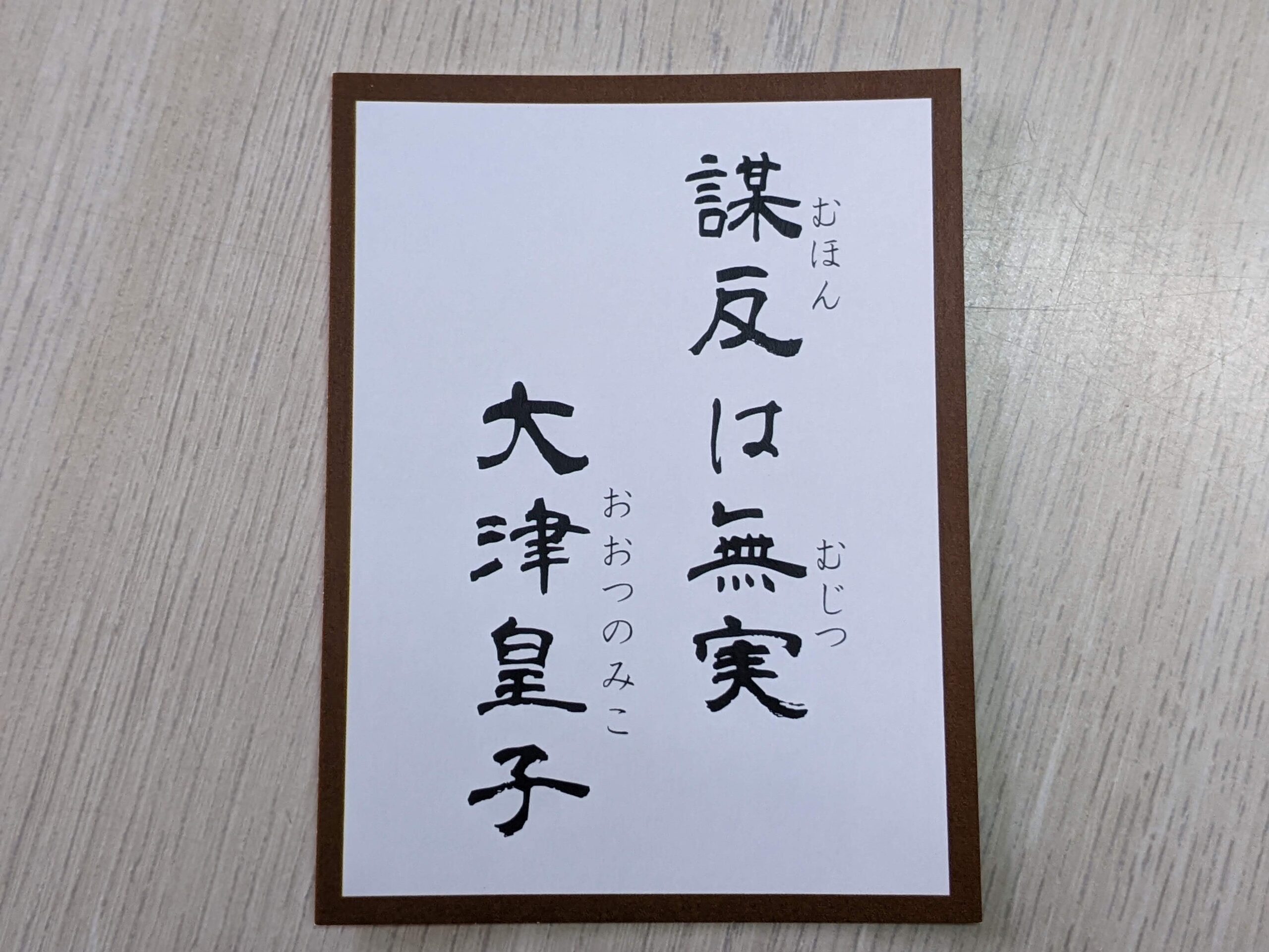 「切り絵でめぐる太子町郷土史かるた」の「む」の読み札、「む:謀反(むほん)は無実 大津皇子(おおつのみこ)」です。