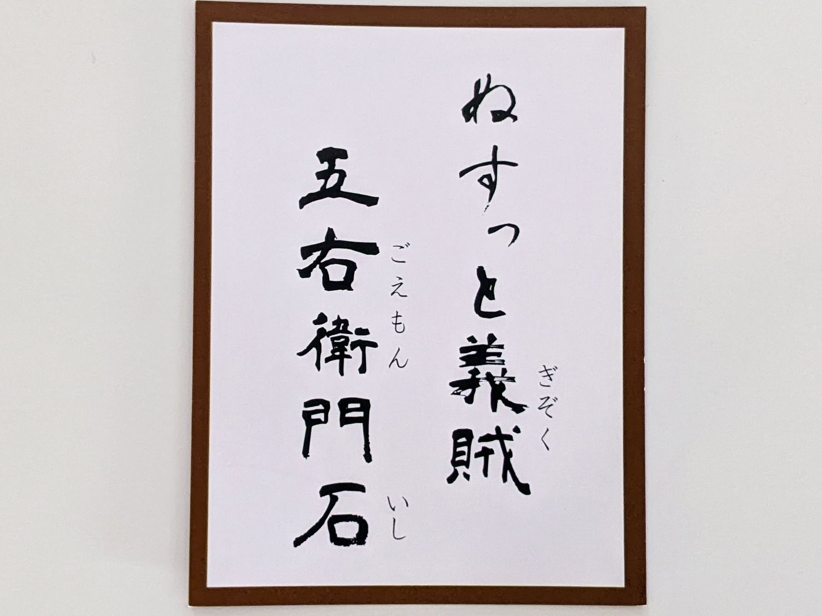 「切り絵でめぐる太子町郷土史かるた」の「ぬ」の読み札は「ぬ:ぬすっと義賊(ぎぞく) 五右衛門石(ごえもんいし)」です。