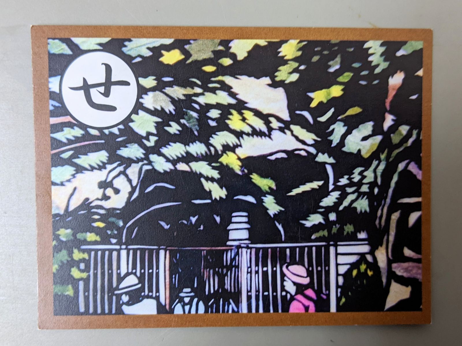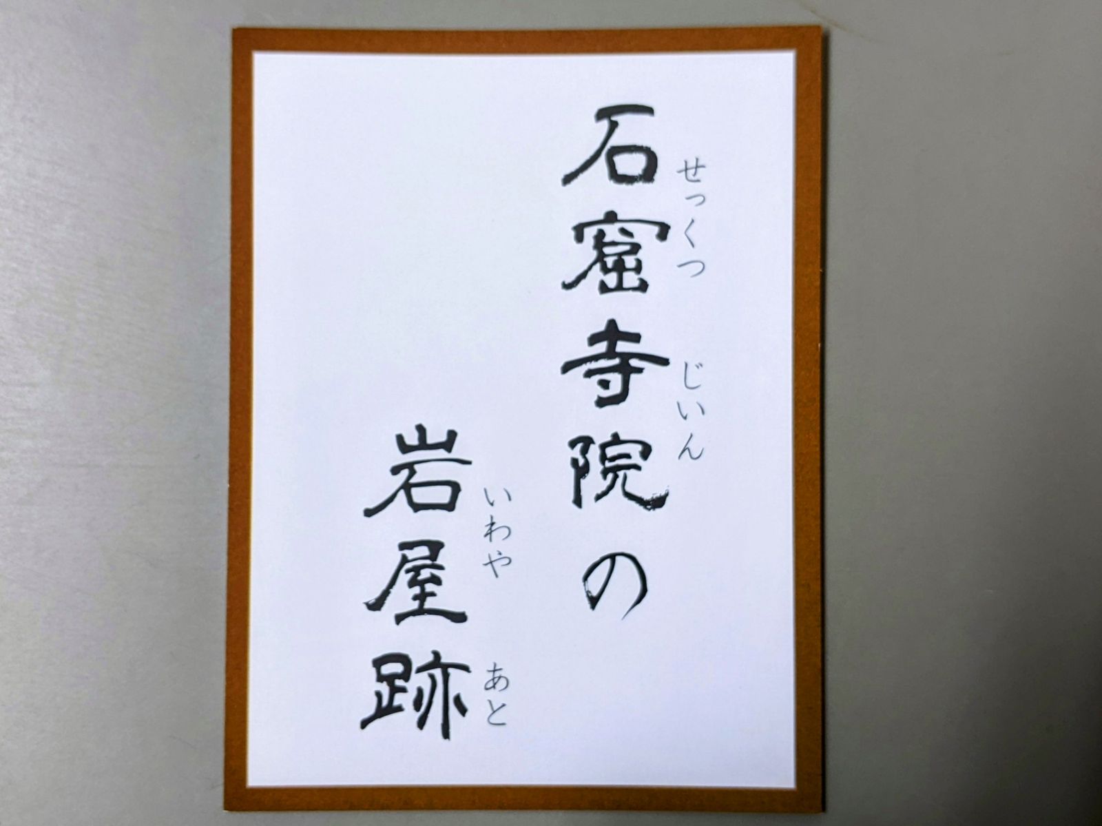絵札には、登山道を登った先に見える石窟寺院の岩屋跡と三重層塔が描かれています。岩屋跡の切り絵からは、一般の方が立ち入らないよう柵をしている様子も伺えます。