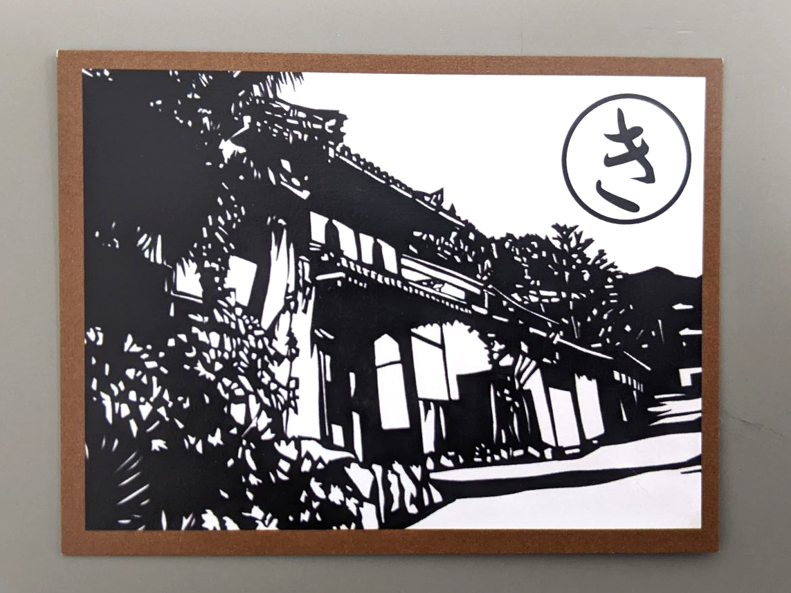 屋敷である旧家は切り絵にて白黒のカラーで表現されていますが、実際に屋敷跡を見ると白い道路と黒い住居に見えることから、忠実に再現されていることが分かります。