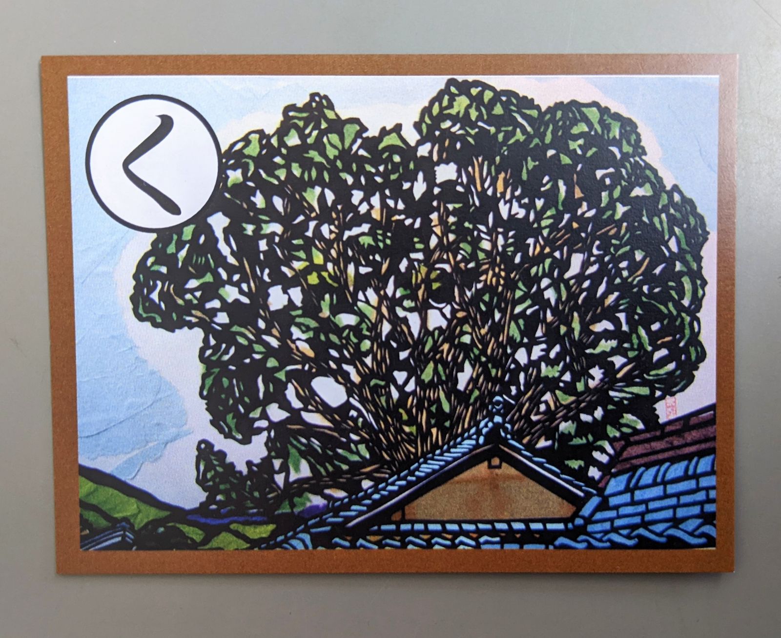 絵札には、鎌田邸の庭先にある大きな楠が描かれています。
