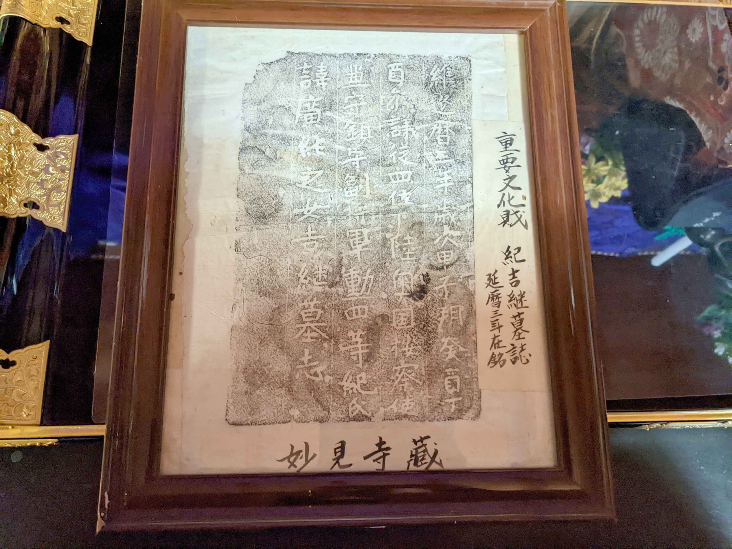 「紀吉継墓誌」の現物は大阪市立美術館に保管されており、妙見寺には拓本が残されています。