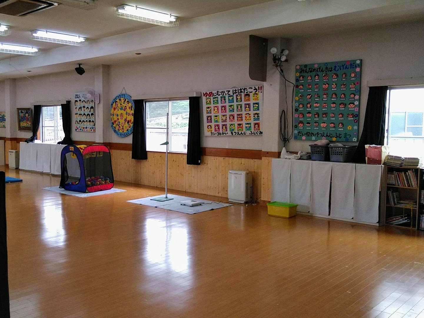 晴れの日は園庭や園舎を開放しており、雨天の場合は松の木保育園は園内のホールを利用しています。やわらぎ幼稚園は雨天中止となっています。