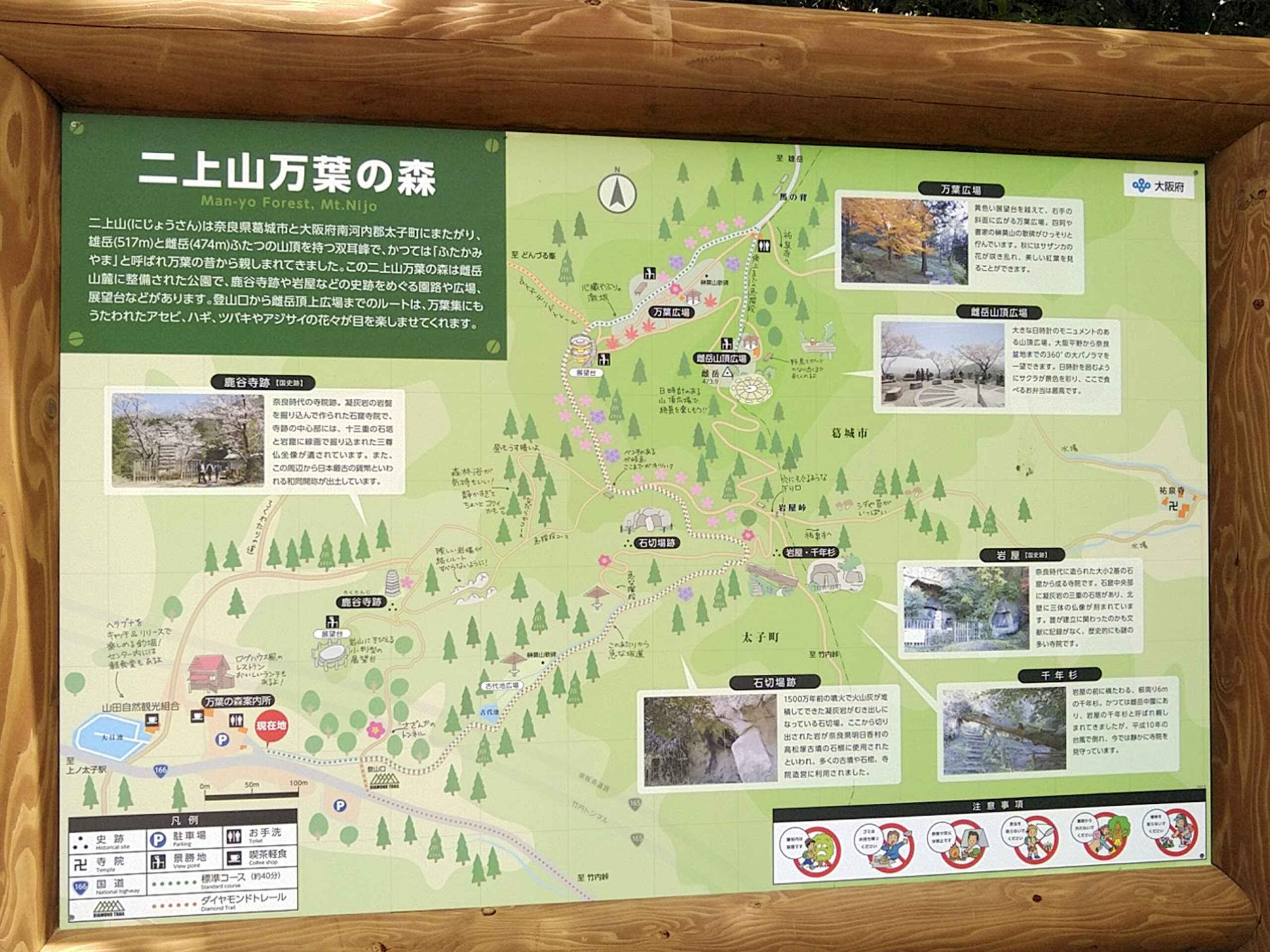 ラクダの背のような2つのコブのような岳があり、大阪府太子町側には鹿谷寺跡のような史跡や古墳なども多く見ることができます。