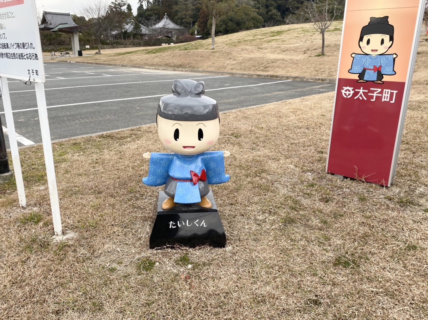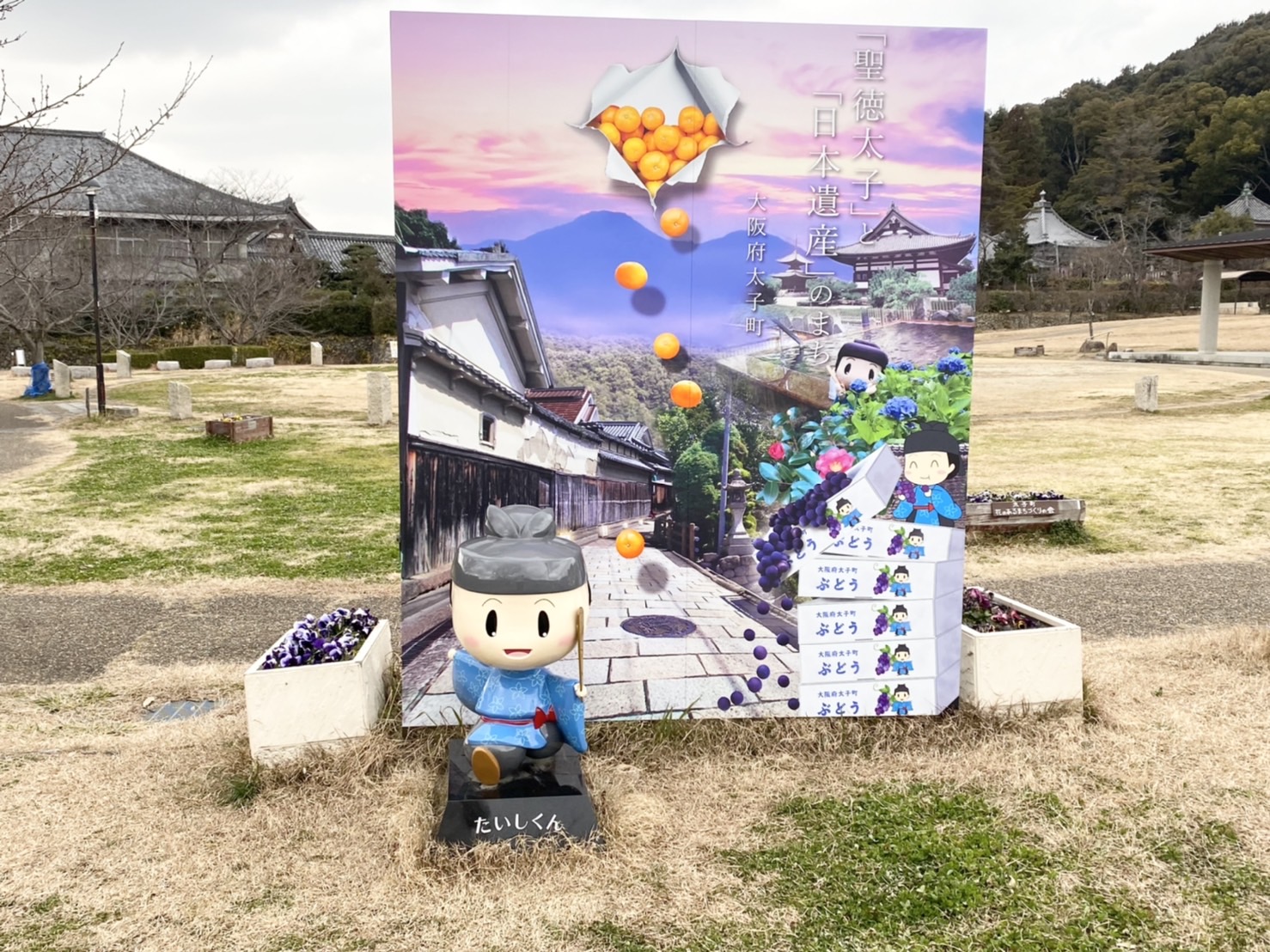 大きな看板には「聖徳太子と日本遺産のまち 太子町」の文字とともに、太子町名産のみかんやぶどう、たいしくんが描かれており、ついつい笑みがこぼれます。