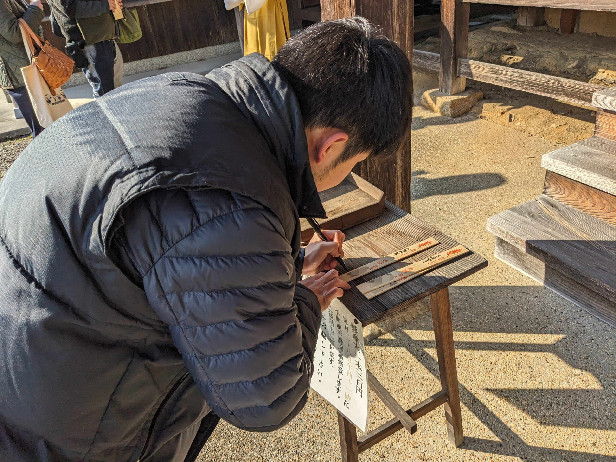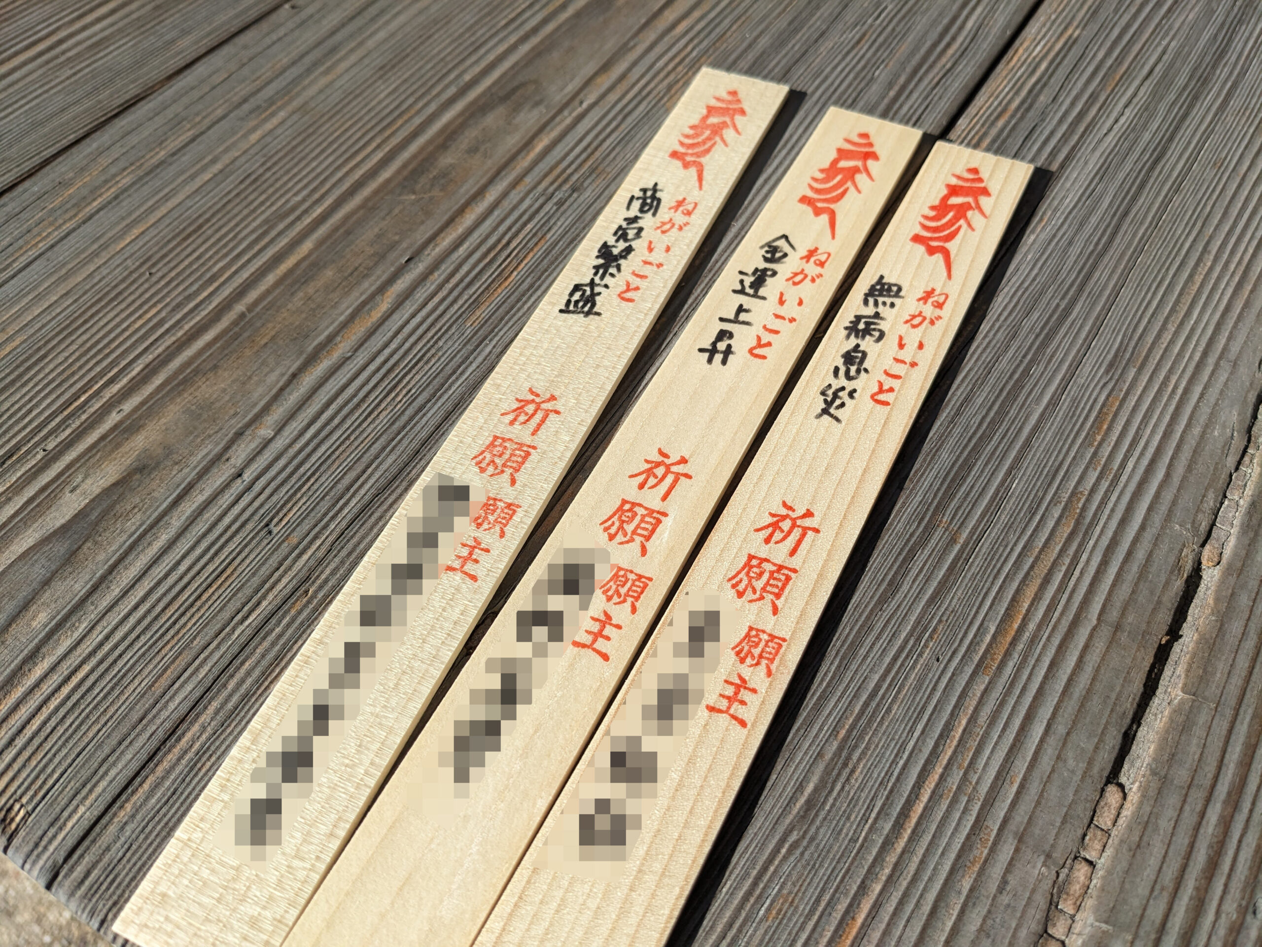 まず、お寺の前に置かれている護摩木ごまぎを購入し、願い事、名前、年齢を記入します。