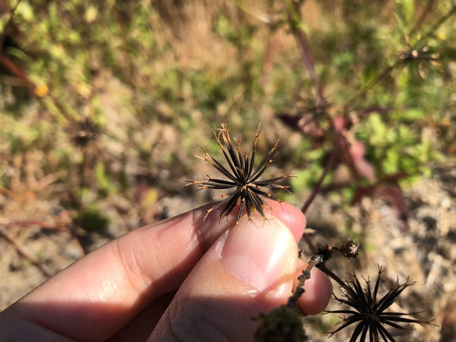 このコセンダングサの種は1cmほどで細長く、先端に二股になった棘がある特徴的な形をしています。