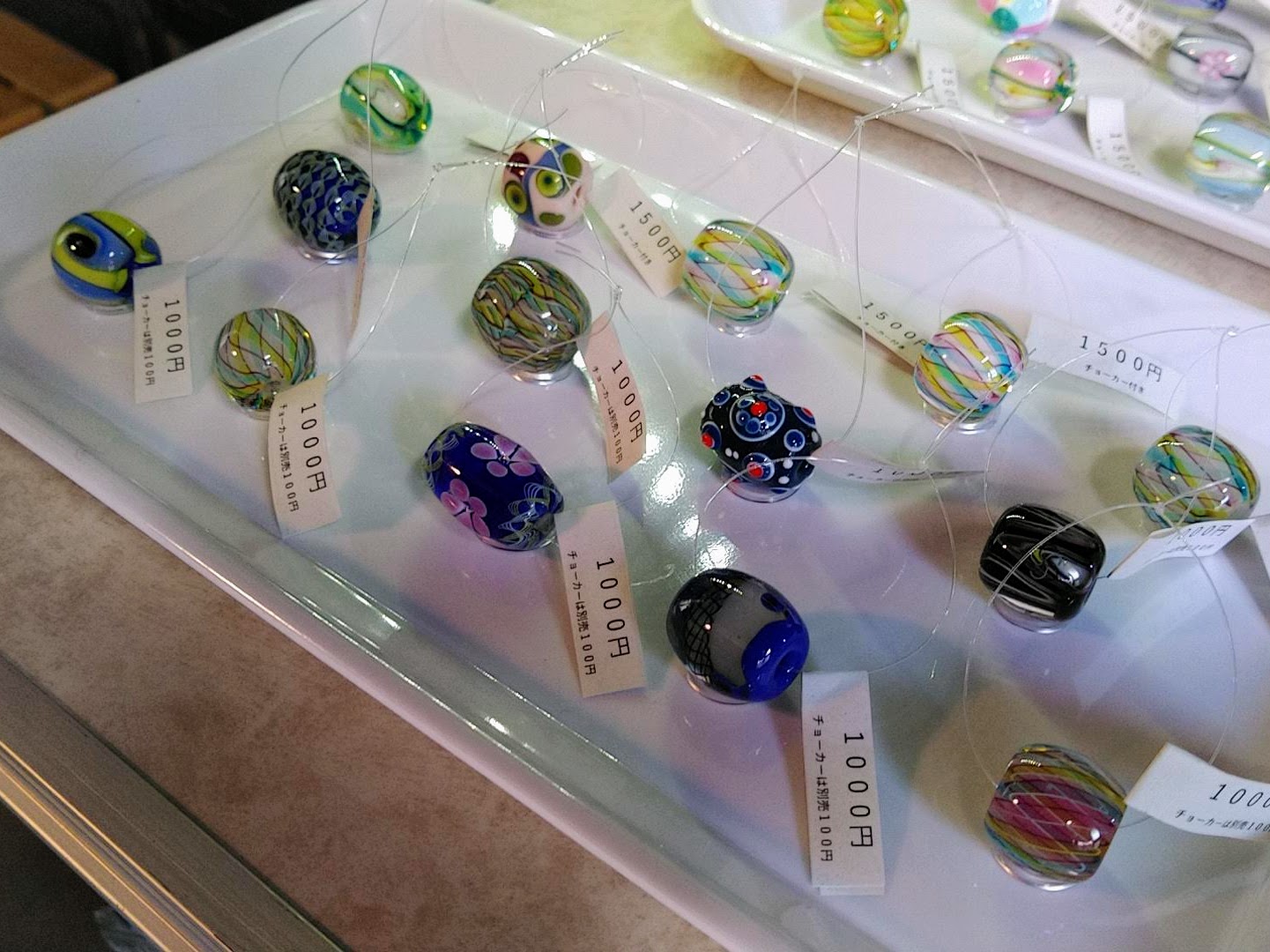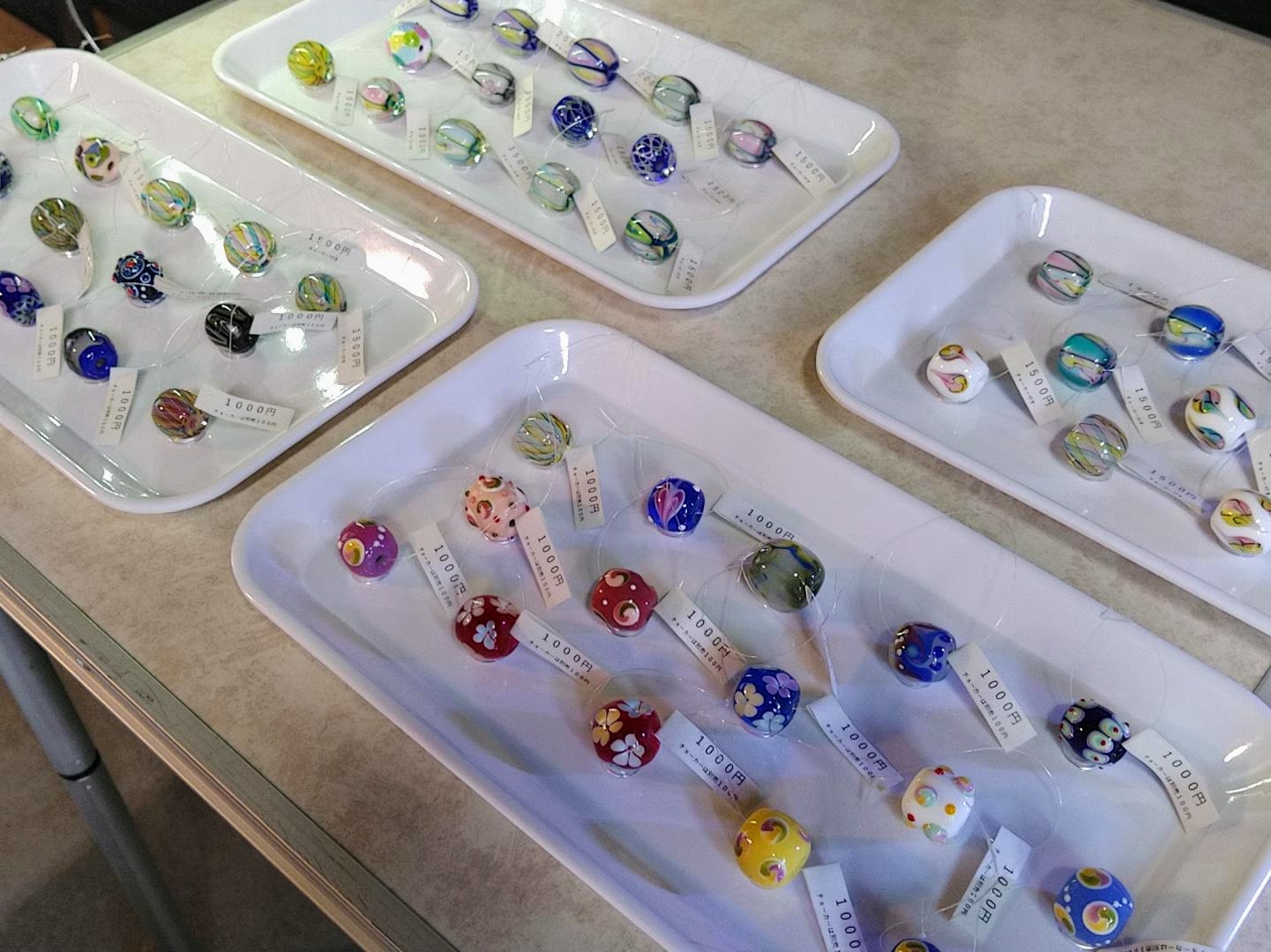 また、とんぼ玉実演・体験の次回の予定は6月12日(日)だそうです。実演・体験するお時間がない方は、先生が作られたとんぼ玉を購入するとこもできます。