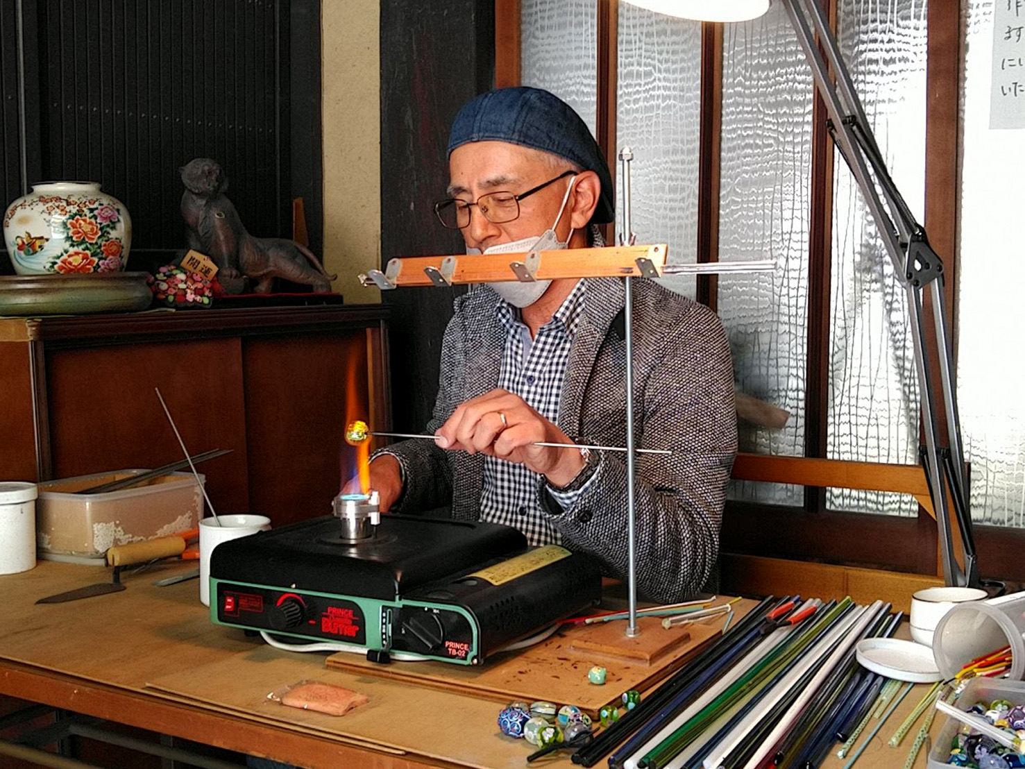 先生と一緒にガラスを溶かして整形し、思い思いの好きな模様を付けて自分だけのとんぼ玉が作れる貴重な体験教室です。