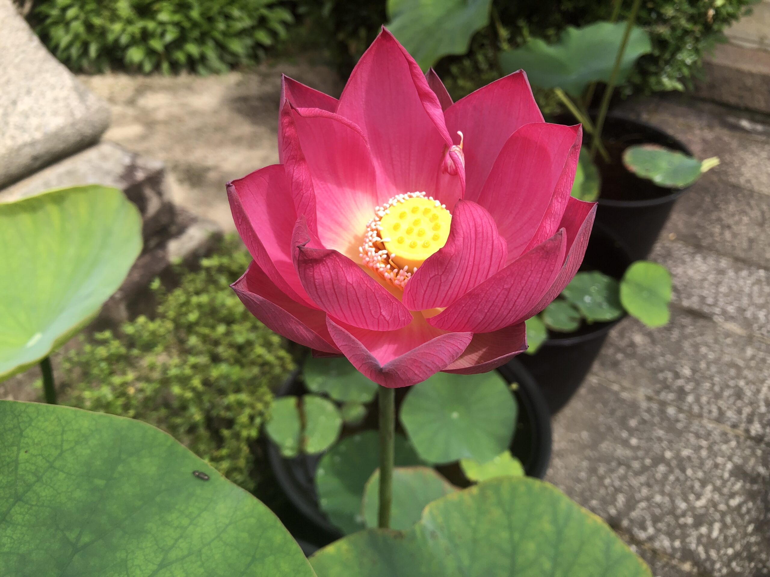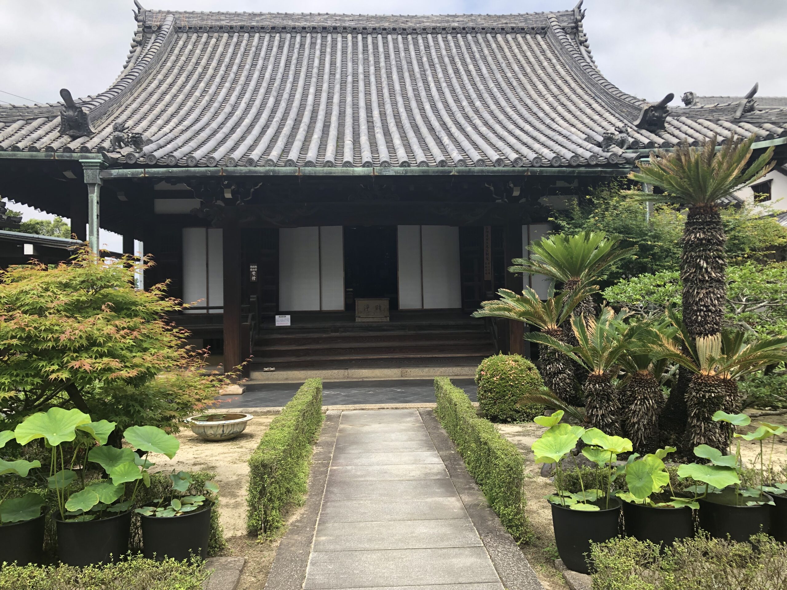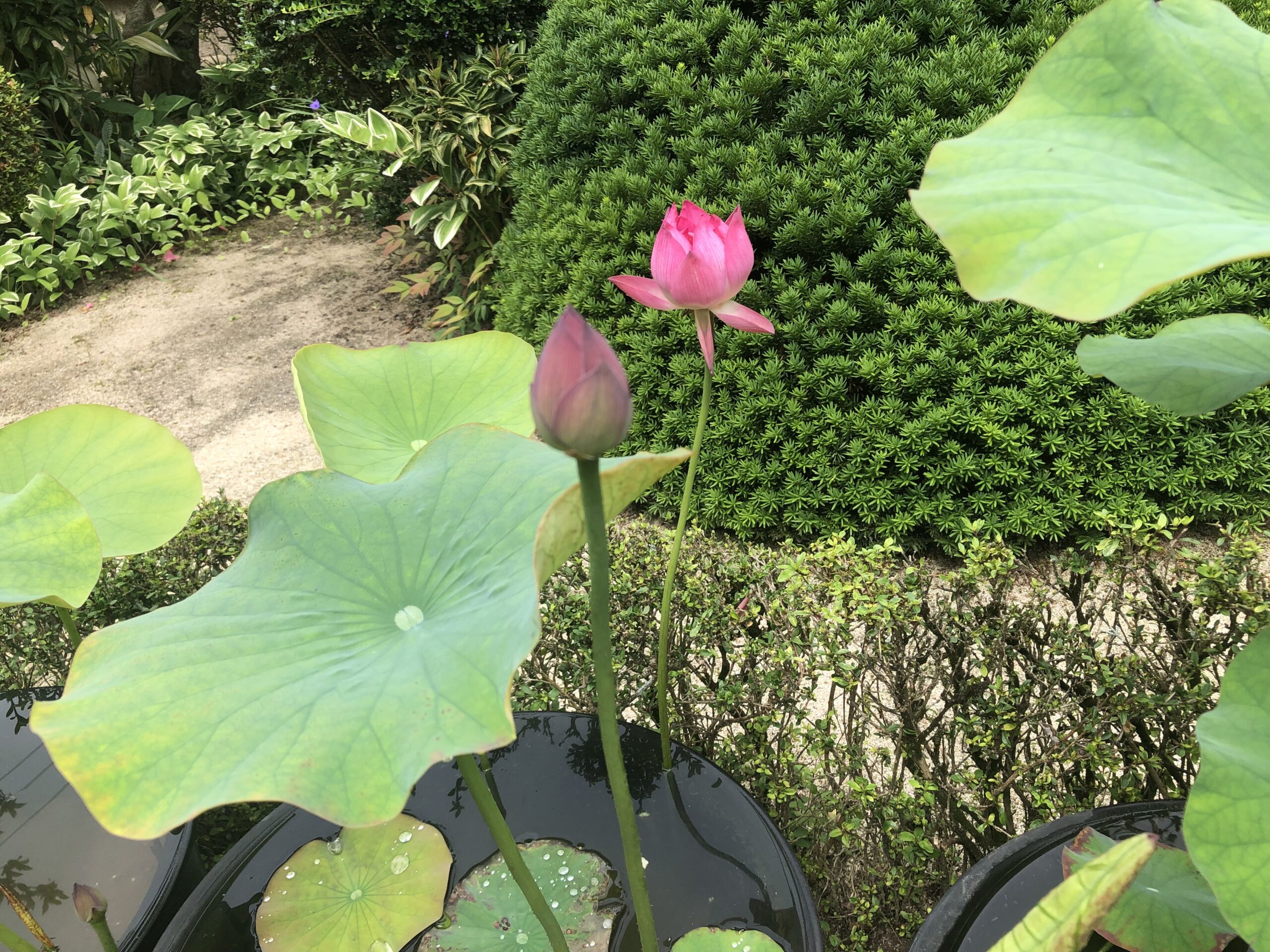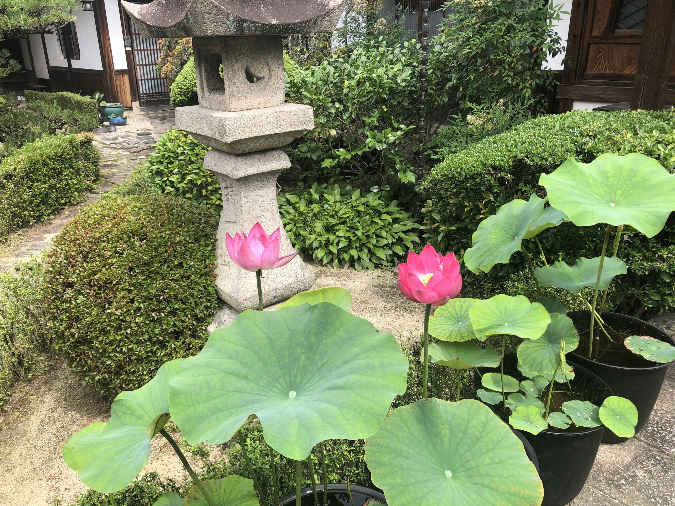 西方院の蓮の花は、通路に並んだ大きな水瓶(みずがめ)に植わっています。