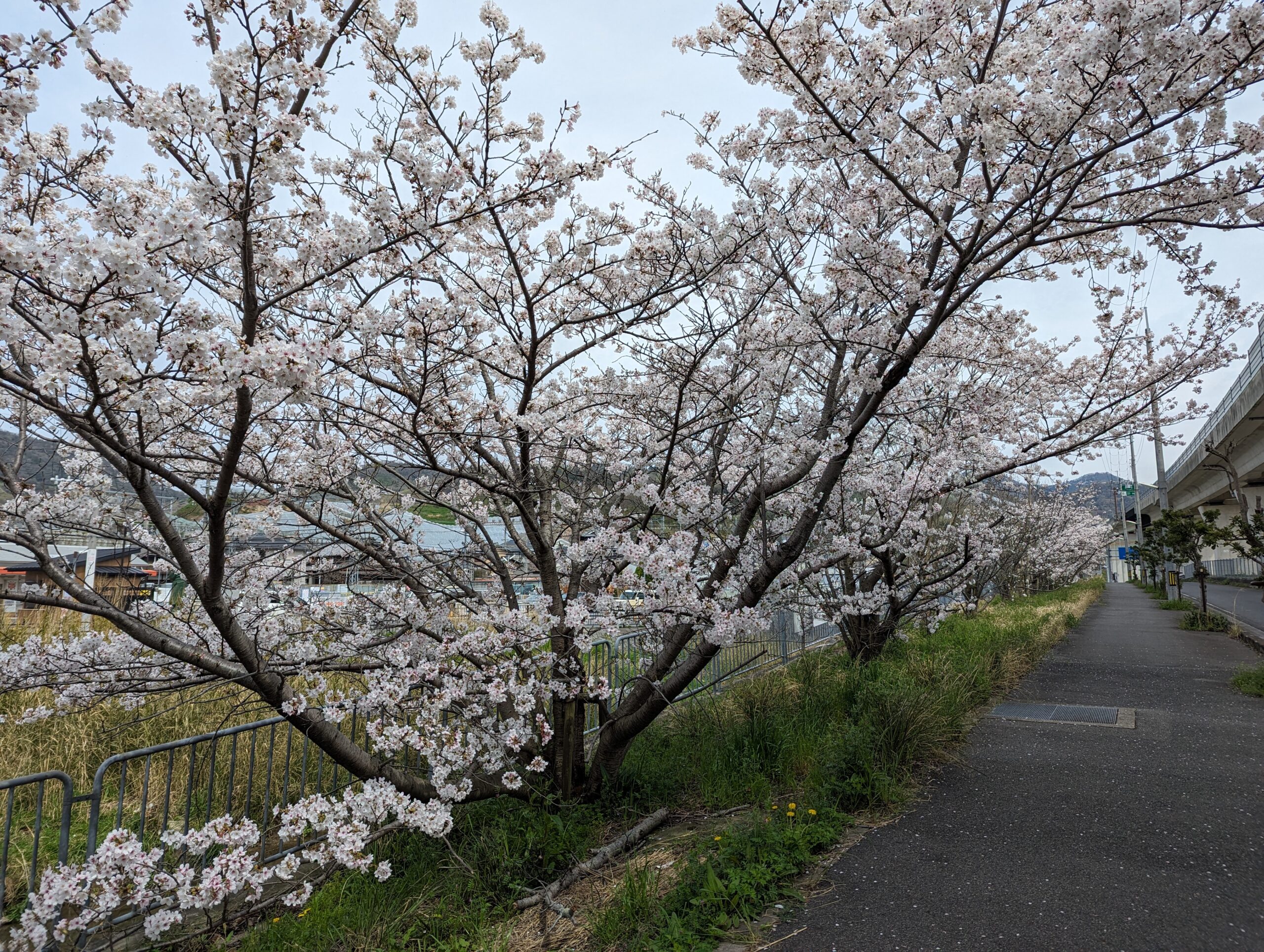 近鉄・上ノ太子駅を降りてすぐ、飛鳥川に沿ってのびる遊歩道に目を向けると、満開の桜がやさしく揺れています。