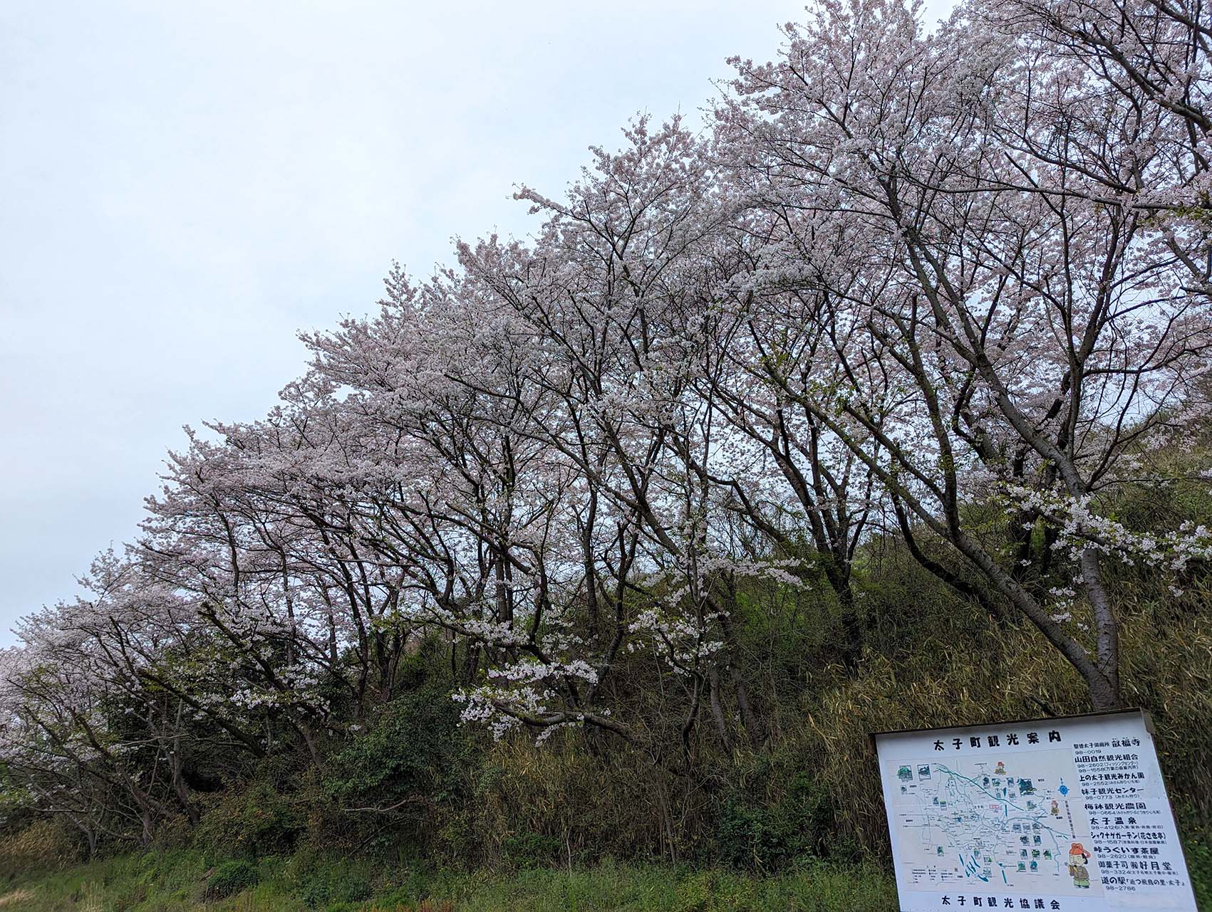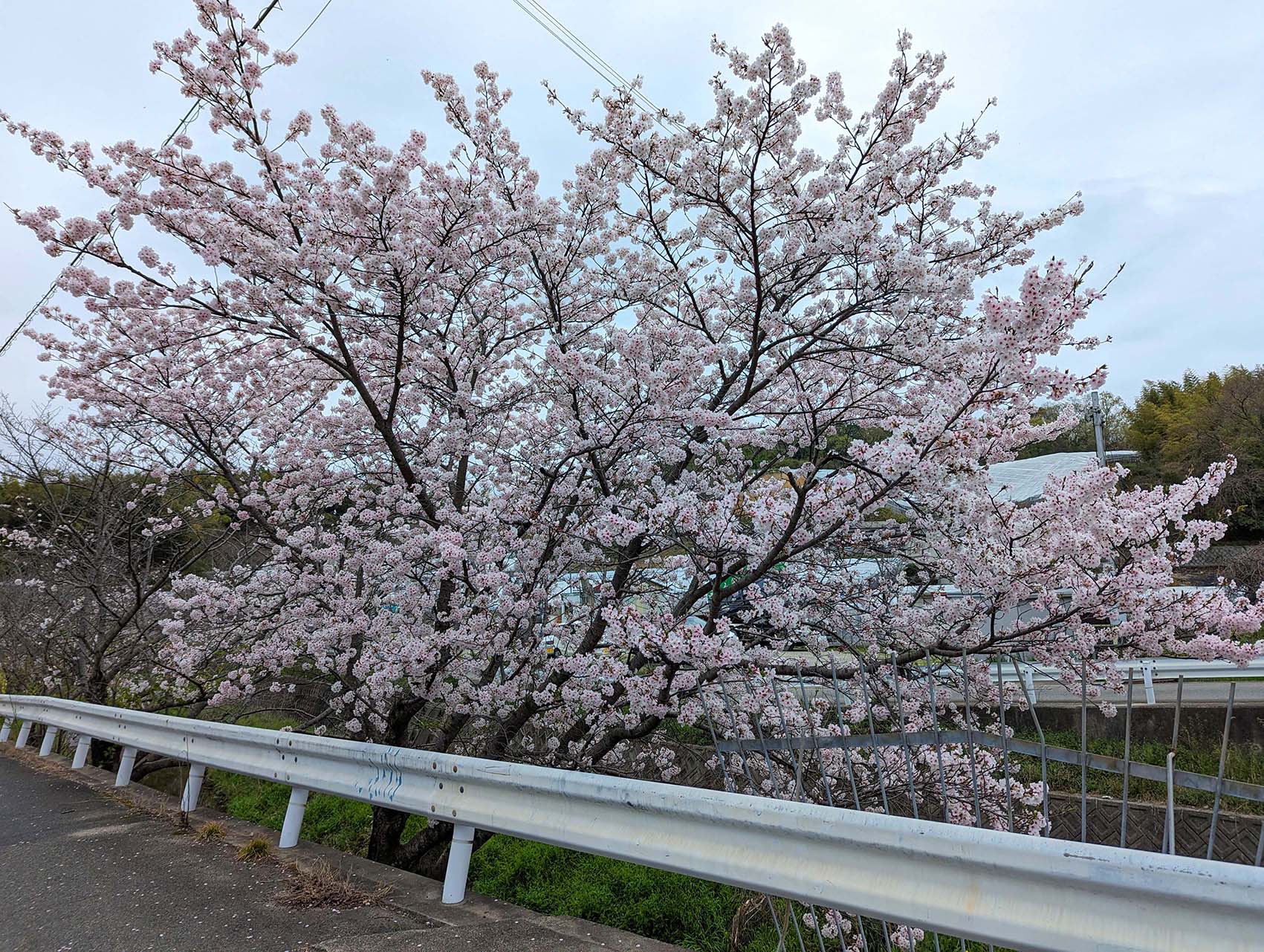 用明天皇陵へと向かう途中、小さな広場のような場所に、見事な枝ぶりの桜が3本。道路の方へ向かって大きく枝を広げていて、近くで見ると迫力があります。