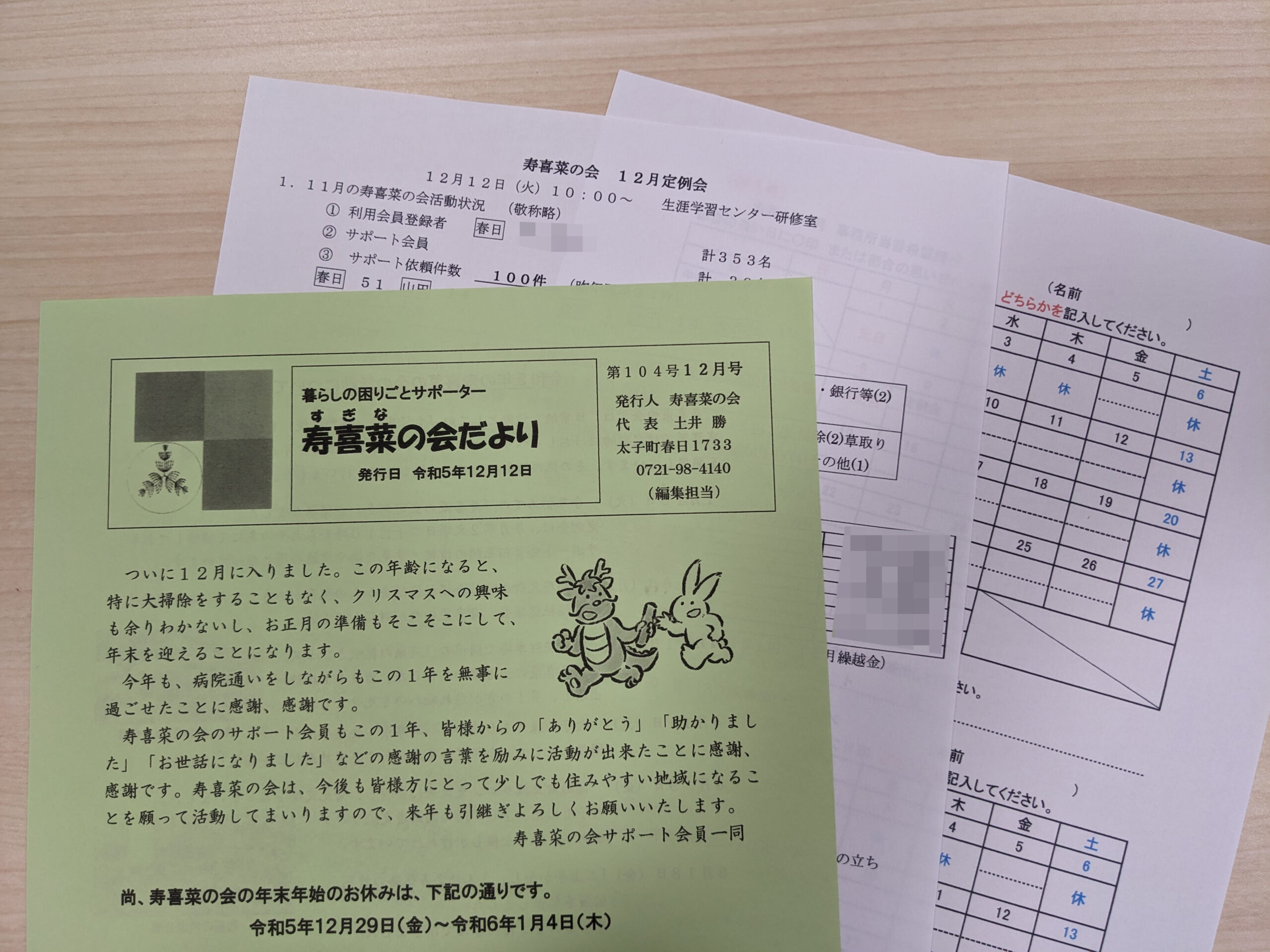| 憩いクラブ | 12月14日 第2木曜日 13:30~15:00 | 利用会員の方々に楽しく過ごしていただきます。お菓子や飲み物を用意しています。※送迎を希望される方は、事前に事務所までご連絡ください。(0721-98-4140)参加費200円 |
