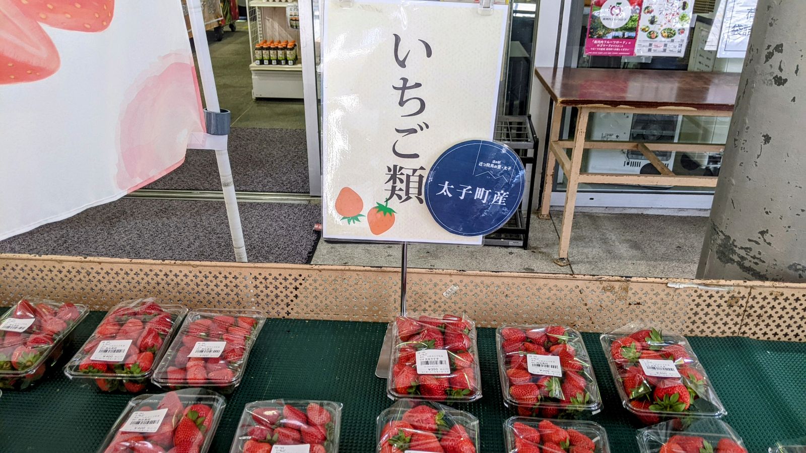いちごの収穫が最盛期を迎えた太子町の道の駅 「近つ飛鳥の里・太子」には、のぼり旗が上がり、周囲はいちごの良い香りで溢れていました。