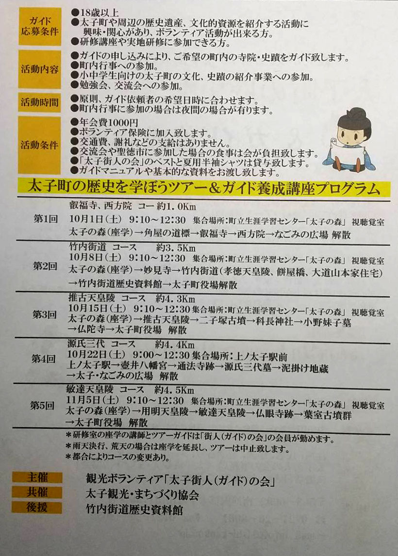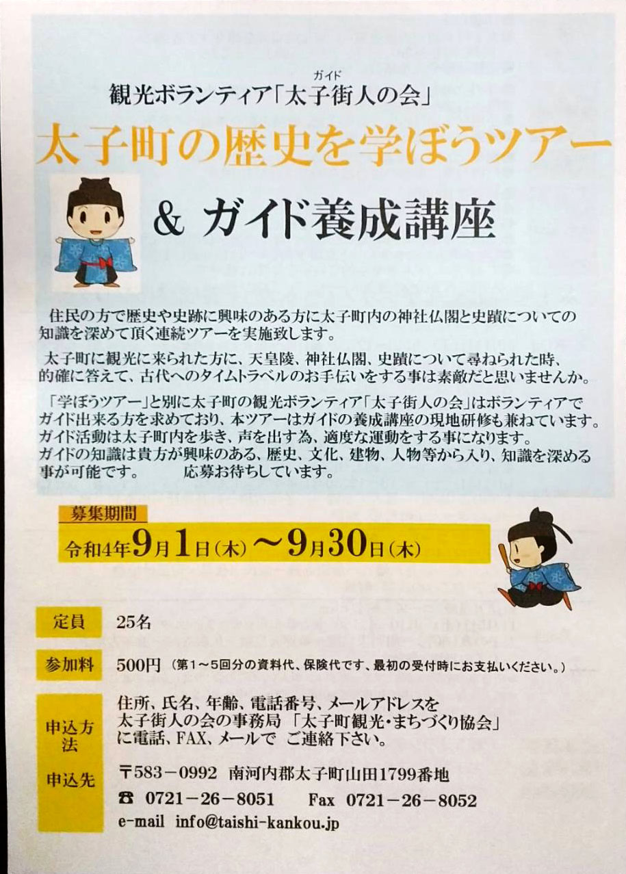 | ガイド募集条件 | 18歳以上で太子町の歴史遺産や文化的資源を紹介するボランティア活動が出来る方(研修講座や実地研修に参加できる方) | |