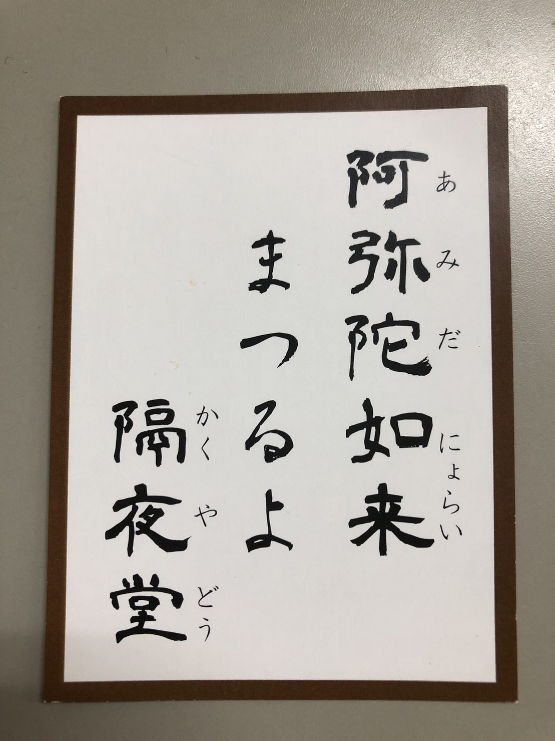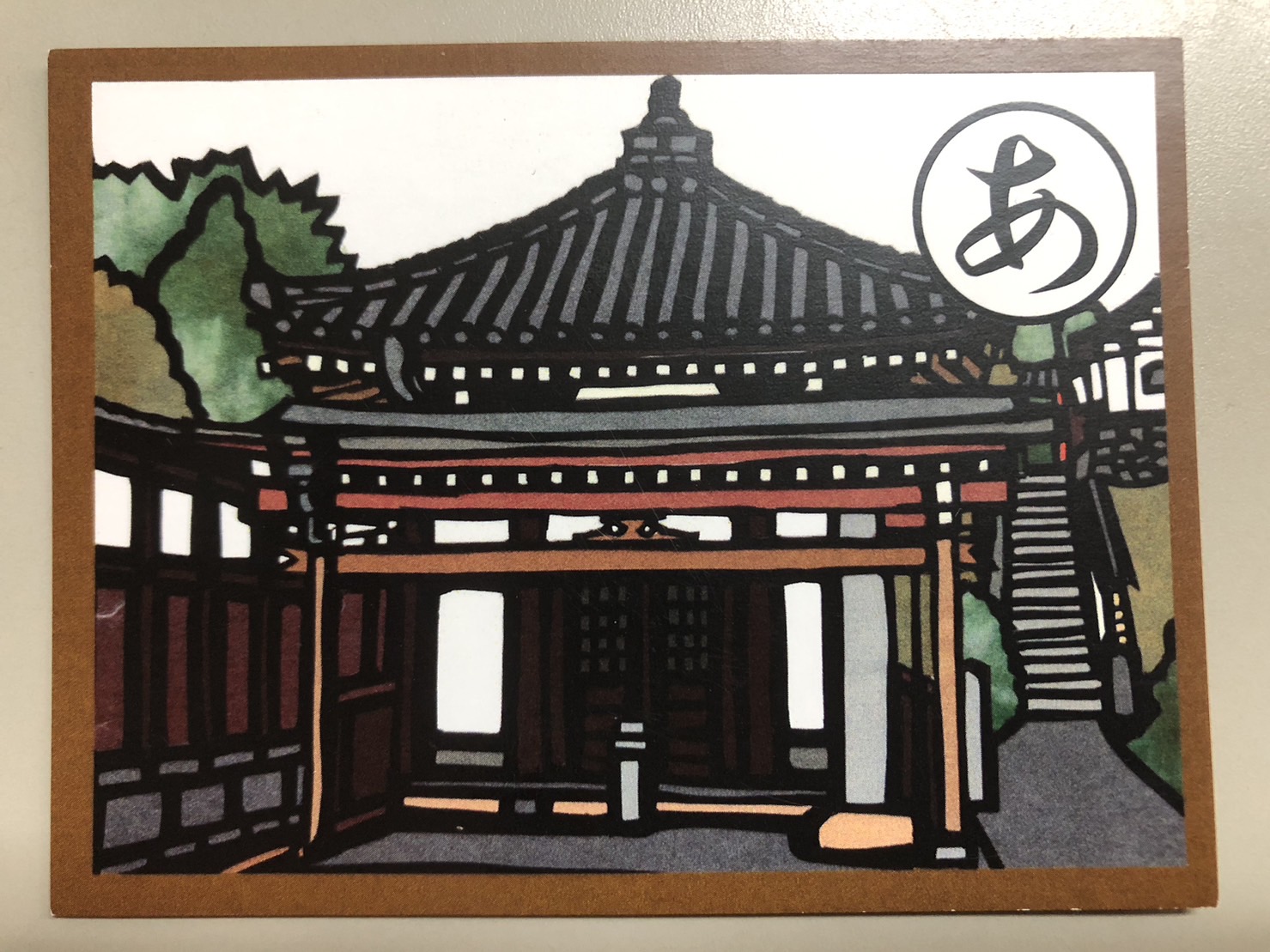 今回は「あ」の札「阿弥陀如来(あみだにょらい)まつるよ隔夜堂(かくやどう)」です。