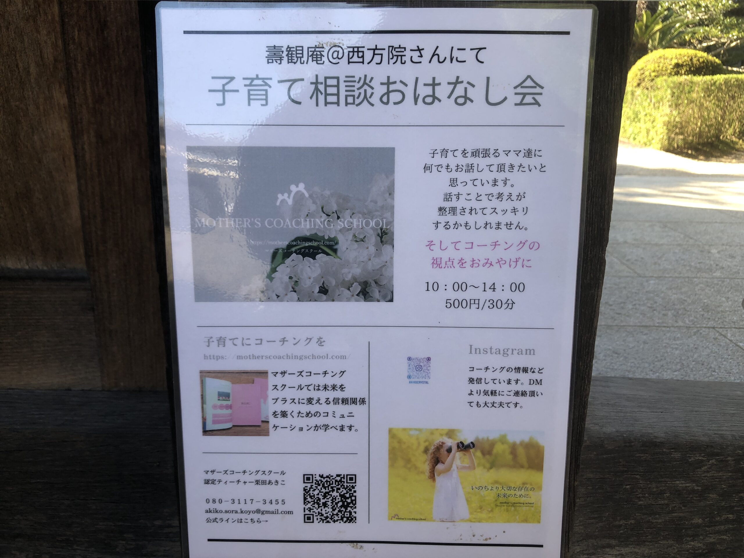 西方院で開催される「子育て相談お話会」のスケジュールは、西法院カフェ壽観庵のInstagramからもご確認いただけます。