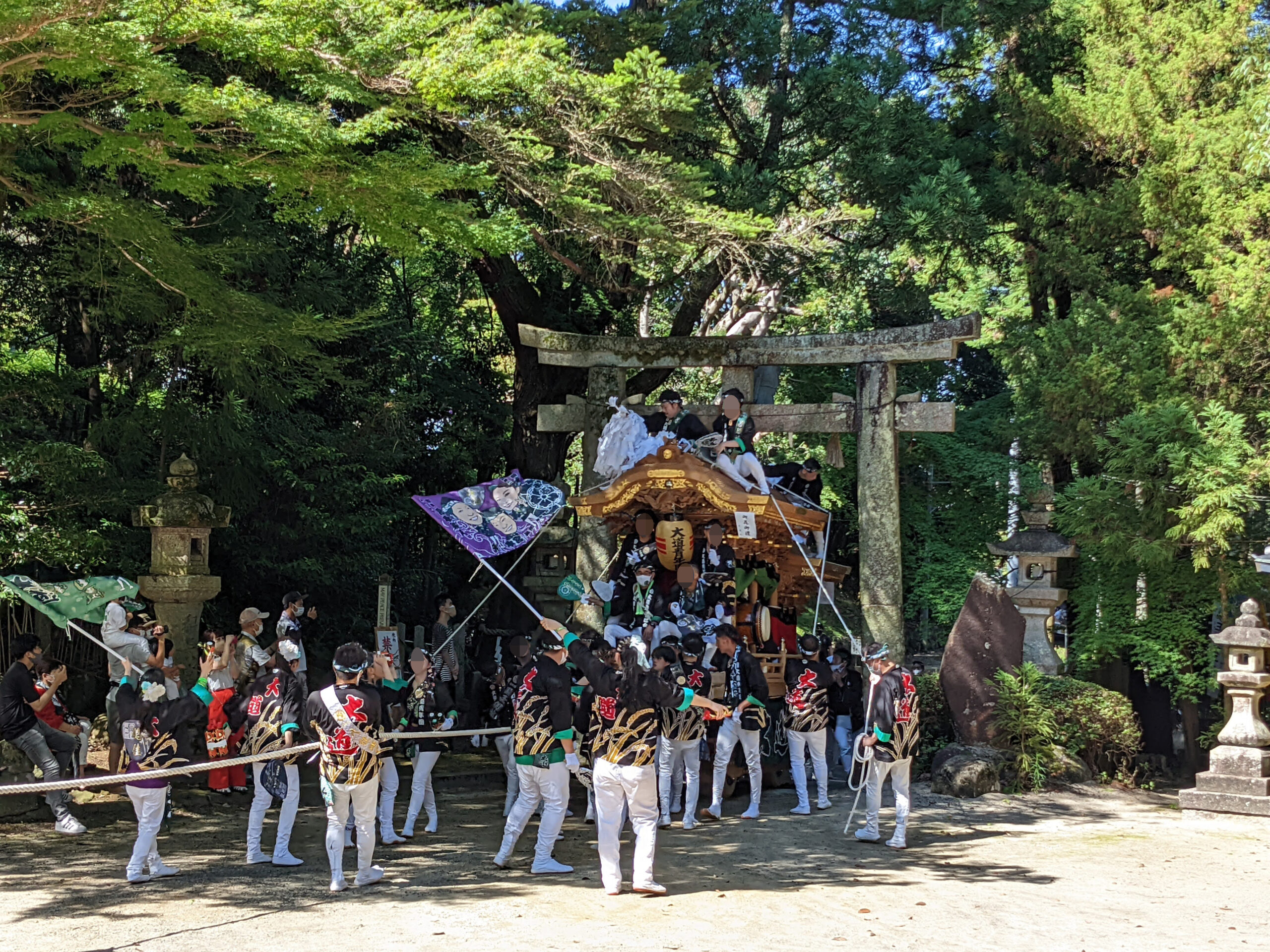 だんじりは鳥居をくぐった後、境内を縦横無尽に曳き回ります。車体を揺らし迫力ある曳行を見せてくれる町内もありました!