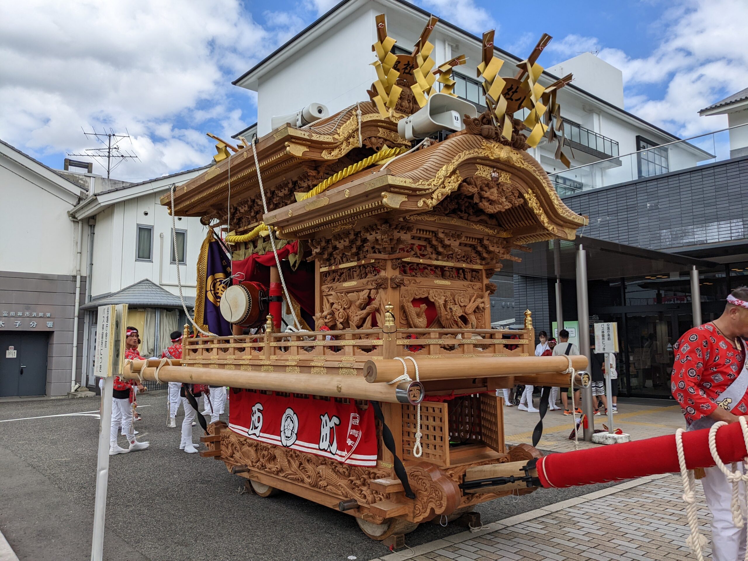 各町会のだんじり曳行は14:00~16:00の間に行われ、それぞれが山田地区を練り歩きます。この日はルートが決まっていないので、お囃子が聞こえてきたらその町会のだんじりが曳かれた合図です。